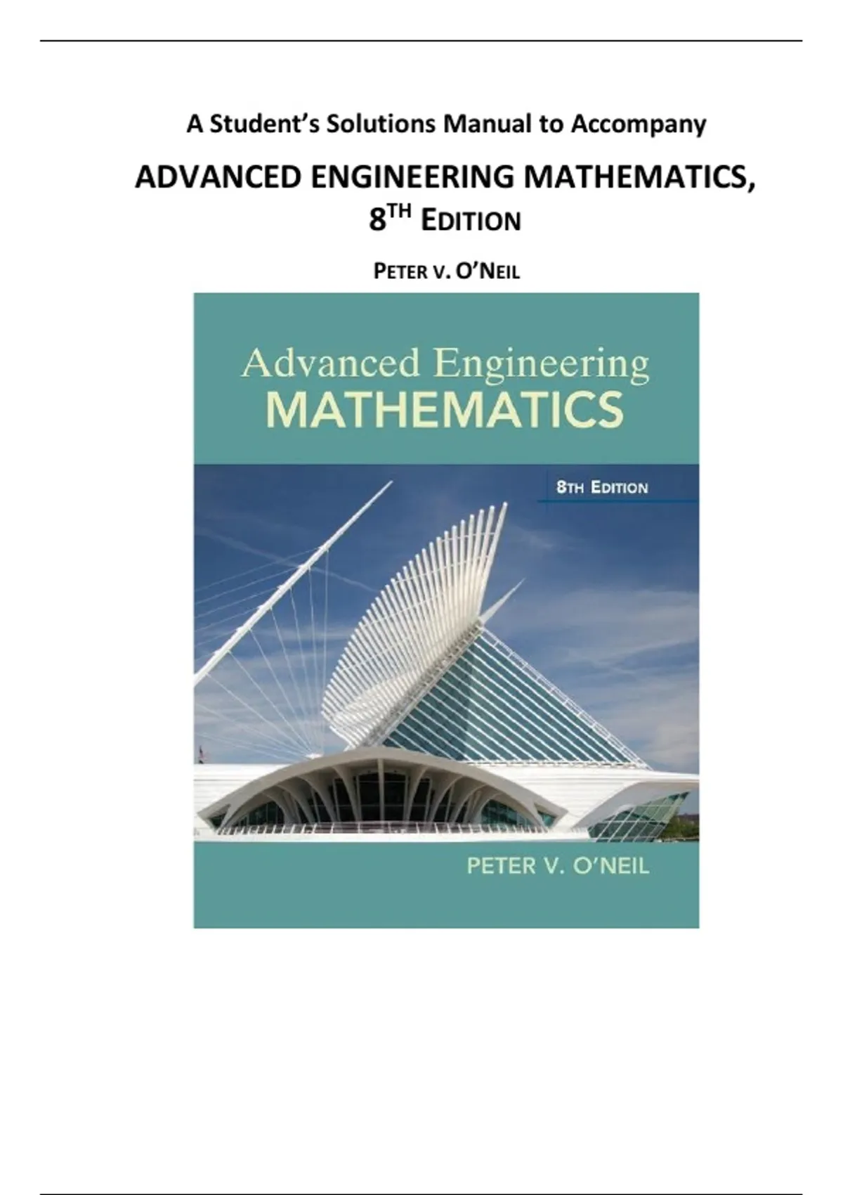 This document is the complete Student’s Solutions Manual for Advanced Engineering Mathematics (8th Edition) by Peter V. O’Neil. It provides detailed step-by-step solutions to problems across all major chapters, including first- and second-order differential equations, Laplace transforms, Sturm–Liouville problems, partial differential equations (heat, wave, and Laplace’s equations), vector calculus, Fourier series and transforms, complex analysis, eigenvalues, matrices, and nonlinear systems. It is a comprehensive resource for engineering and applied mathematics students to practice problem-solving with fully worked examples.