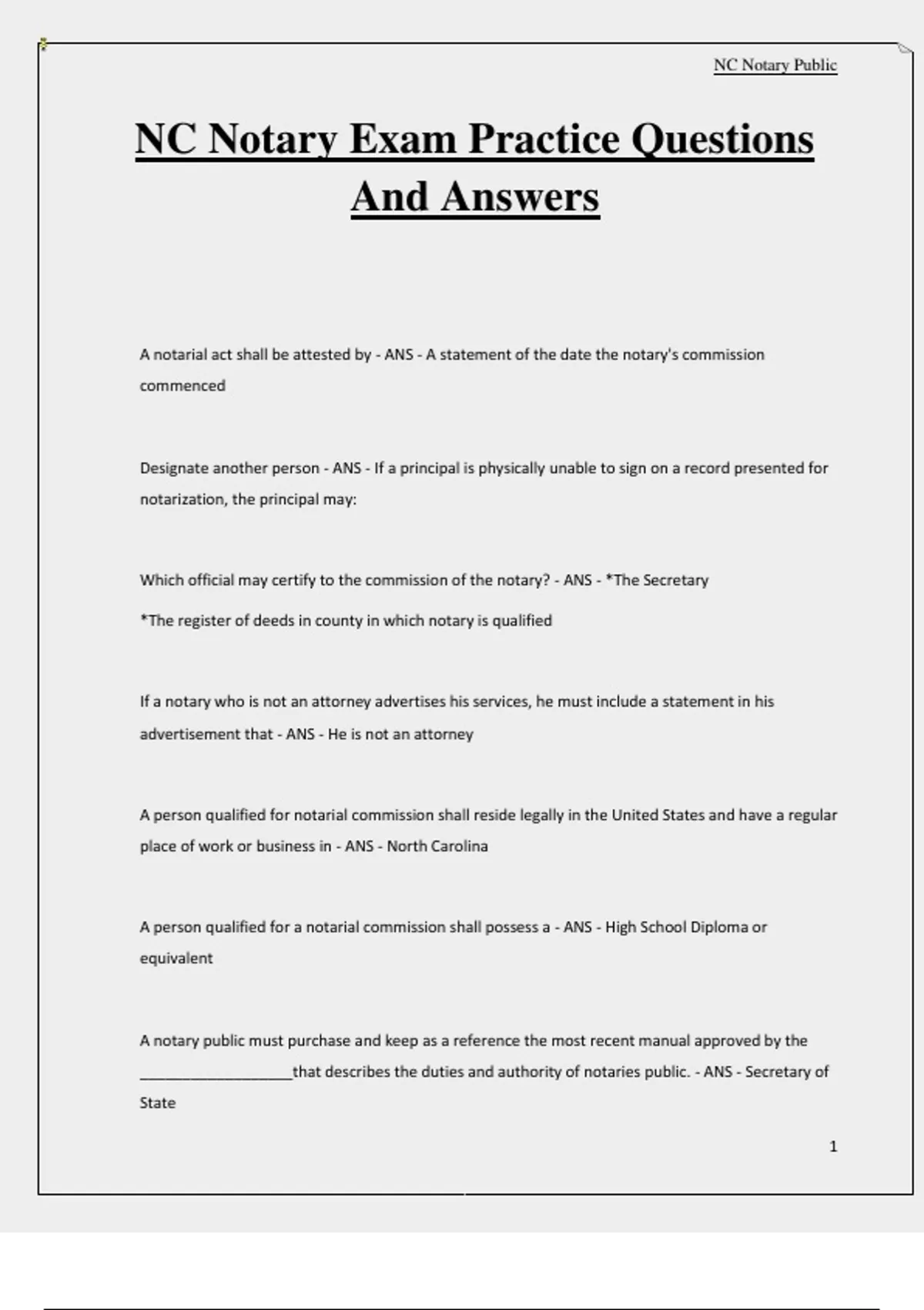 NC Notary Exam Practice Questions And Answers