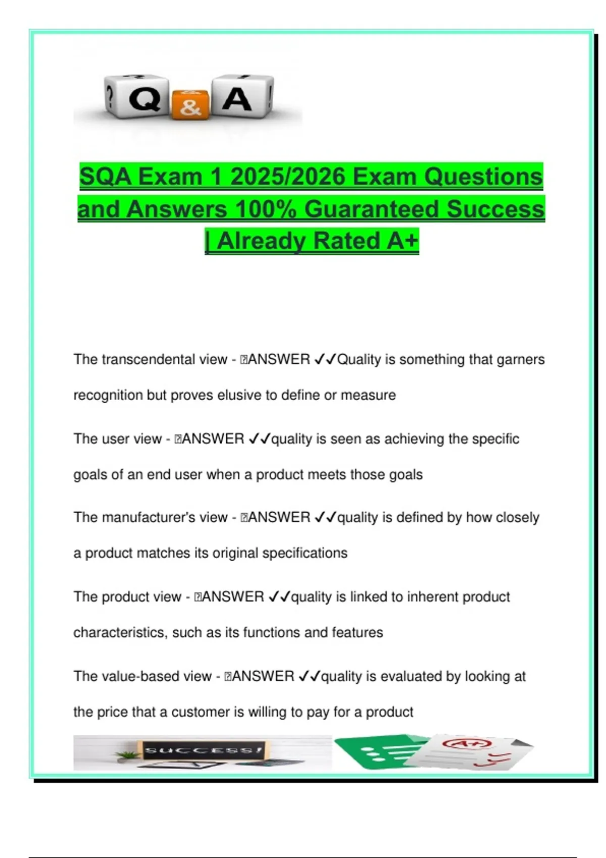 This document contains over 100 exam-focused questions and accurate answers for Software Quality Assurance Exam 1, aligned with the 2025/2026 academic year. Built for university-level students and certification candidates, it covers a wide range of SQA theory, testing models, quality metrics, and practical application of testing techniques such as black-box, white-box, and integration testing. The content opens with definitions of software quality from multiple perspectives: Transcendental, User, Manufacturer, Product, and Value-based views It then addresses quality-related attributes such as correctness, reliability, maintainability, and performance—including how each is measured. Further sections provide in-depth explanation and exam-ready answers on: SQA cost categories: Prevention, Appraisal, Internal and External Failure Costs Quality Planning, Assurance, and Control, including SQP, SQC, SQI SDLC phases, including requirement specification, development, testing, maintenance Testing methodologies: Black-box testing (Equivalence Partitioning, Boundary Value Analysis, Decision Tables, State Transition) White-box and grey-box testing System, Unit, UAT, Alpha, Beta, Regression, Performance testing Bug lifecycle, roles of tester and developer, and differences between debugging and testing Definitions of key test elements like test cases, test data, expected outputs, and verification methods Advanced concepts such as cyclomatic complexity, interface misuse, and scenario-based release testing Real-world examples and use cases (e.g., thermostats, tax calculations, menu navigation) are used to illustrate how test cases and test design techniques are applied in practice. This document is perfect for: Students in Software Engineering, Computer Science, Information Systems, and QA specialization tracks Learners preparing for ISTQB, CSQA, or institutional SQA exams QA professionals seeking a knowledge refresher on black-box testing methods Tutors and trainers creating test banks, practice sessions, or review lectures Keywords: software quality assurance, software testing, black-box testing, quality metrics, SDLC, verification, validation, bug lifecycle, prevention costs, internal failure, external failure, SQP, SQC, quality views, decision table testing, state transition testing, equivalence partitioning, boundary value analysis, cyclomatic complexity, regression testing, performance testing, UAT, alpha testing, beta testing, test cases, test data, debugging, white-box testing, quality attributes, reliability, maintainability
