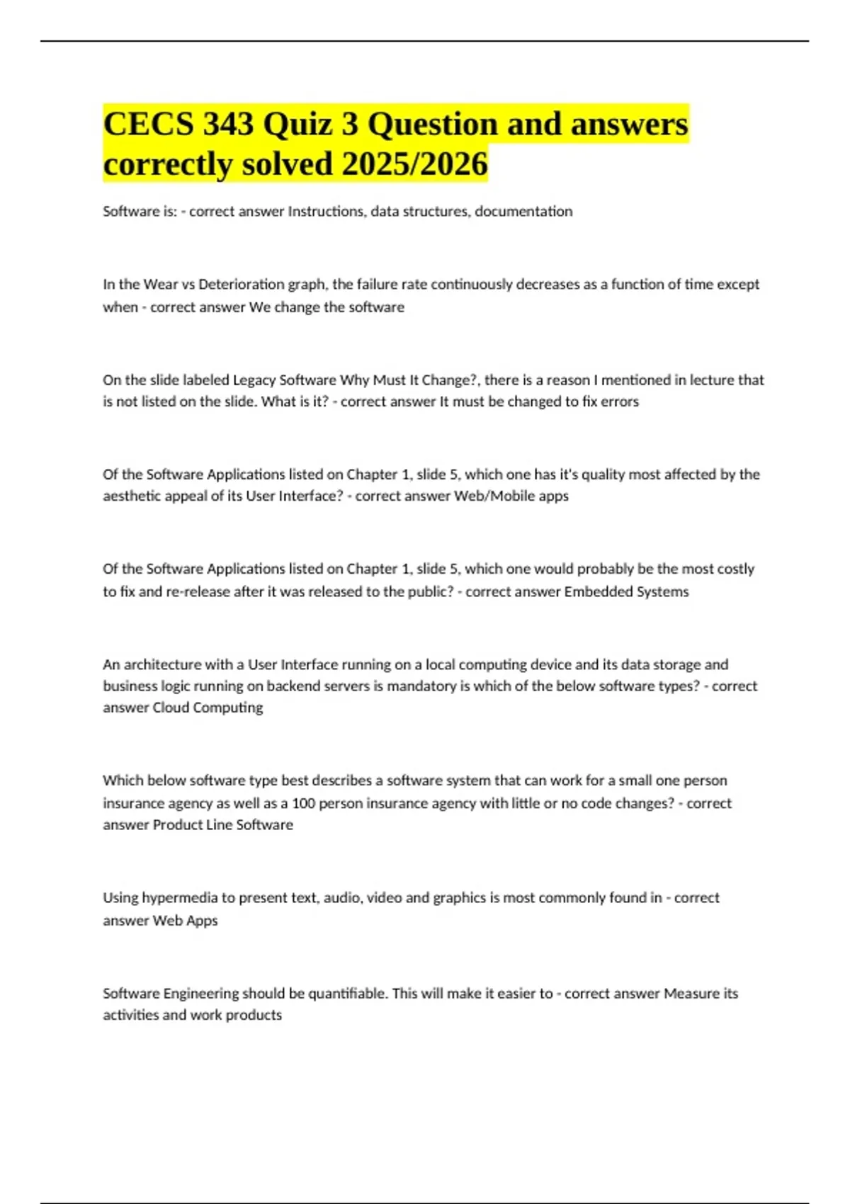 CECS 343 Quiz 3 Question and answers correctly solved 2025/2026 Software is: - correct answer Instructions, data structures, documentation In the Wear vs Deterioration graph, the failure rate continuously decreases as a function of time except when - correct answer We change the software On the slide labeled Legacy Software Why Must It Change?, there is a reason I mentioned in lecture that is not listed on the slide. What is it? - correct answer It must be changed to fix errors Of the Software Applications listed on Chapter 1, slide 5, which one has it's quality most affected by the aesthetic appeal of its User Interface? - correct answer Web/Mobile apps Of the Software Applications listed on Chapter 1, slide 5, which one would probably be the most costly to fix and re-release after it was released to the public? - correct answer Embedded Systems An architecture with a User Interface running on a local computing device and its data storage and business logic running on backend servers is mandatory is which of the below software types? - correct answer Cloud Computing Which below software type best describes a software system that can work for a small one person insurance agency as well as a 100 person insurance agency with little or no code changes? - correct answer Product Line Software Using hypermedia to present text, audio, video and graphics is most commonly found in - correct answer Web Apps