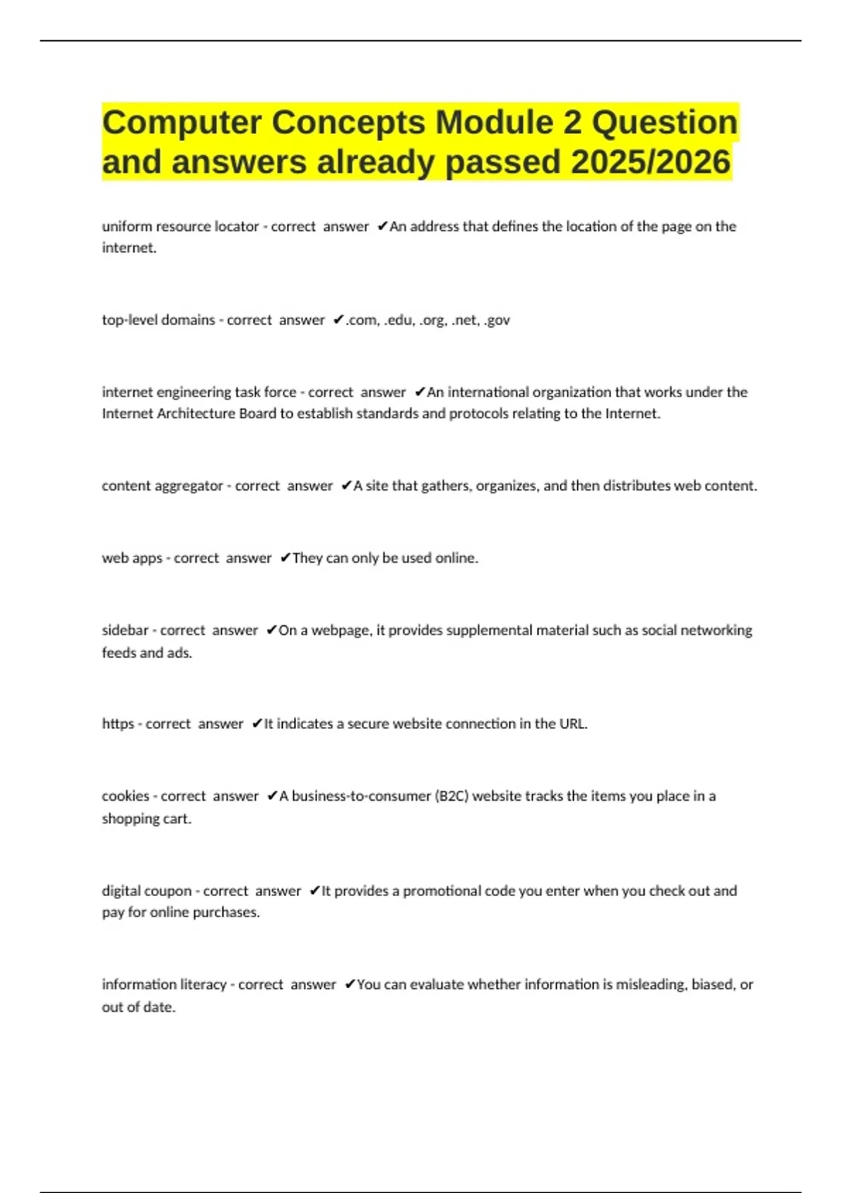 Computer Concepts Module 2 Question and answers already passed 2025/2026 uniform resource locator - correct answer An address that defines the location of the page on the internet. top-level domains - correct answer .com, .edu, .org, .net, .gov internet engineering task force - correct answer An international organization that works under the Internet Architecture Board to establish standards and protocols relating to the Internet. content aggregator - correct answer A site that gathers, organizes, and then distributes web content. web apps - correct answer They can only be used online. sidebar - correct answer On a webpage, it provides supplemental material such as social networking feeds and ads. https - correct answer It indicates a secure website connection in the URL.