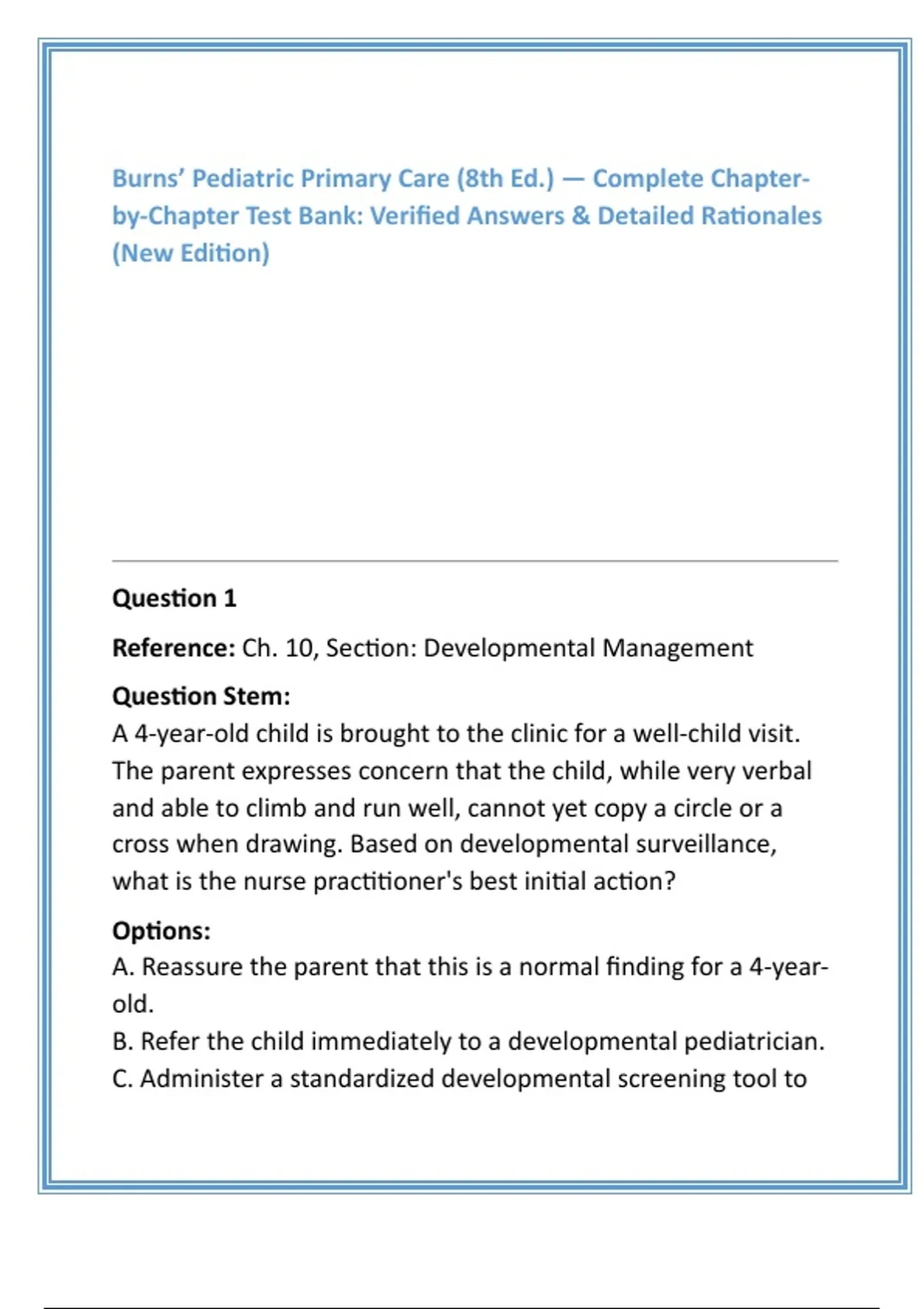 Burns' Pediatric Primary Care 8th Edition Test Bank | NCLEX Prep Pediatric Primary Care Test Bank: 20 MCQs per Chapter & Rationales SEO-Friendly Description Master the core concepts of pediatric primary care and excel on your exams with the complete Test Bank for Burns' Pediatric Primary Care, 8th Edition. This essential resource, crafted by experts Dawn Lee Garzon, Mary Dirks, Martha Driessnack, Karen G. Duderstadt, and Nan M. Gaylord, provides comprehensive coverage of the entire textbook, ensuring you are fully prepared for course assessments, certification boards, and clinical practice. Our test bank features 20 expertly written multiple-choice questions (MCQs) for each chapter, each designed to mirror the rigor and style of the NCLEX, HESI, and other certification exams. Beyond just correct answers, every question includes step-by-step rationales that break down the evidence-based reasoning, transforming your study sessions into powerful learning opportunities. For instructors, this is a ready-made tool for creating valid and reliable quizzes and exams. Invest in your success. This test bank is your key to building diagnostic confidence, understanding advanced practice decision-making, and achieving top scores. Get the competitive edge you need to pass your exams and provide exceptional pediatric care. Key Features: 20 MCQs with answers per textbook chapter 100% alignment with Burns' 8th Edition content Detailed rationales for correct and incorrect options Ideal for NCLEX-RN, HESI, PNP certification review, and course instruction High-Impact Keywords Burns Pediatric Primary Care Test Bank Pediatric Primary Care 8th Edition NCLEX Pediatric Questions HESI Exam Prep PNP Certification Review Nursing Test Bank Pediatric Nurse Practitioner Garzon Dirks Duderstadt Nursing School Resources Chapter MCQs with Rationales 10 SEO-Driven Hashtags #BurnsPediatricTestBank #PediatricPrimaryCare #NCLEXPrep #HESIExam #PNPCertification #NursingSchool #TestBank #NursingStudents #PediatricNP #Burns8thEdition