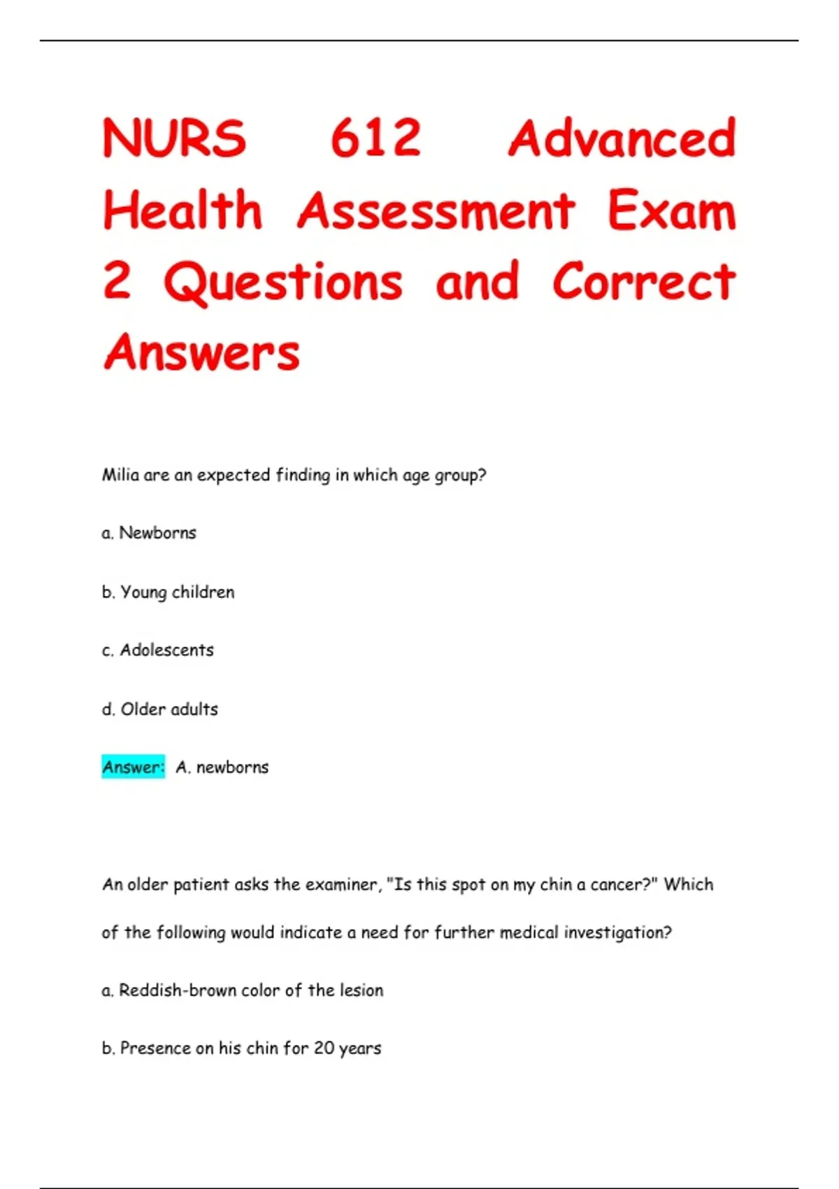 This document contains the full set of Exam 2 questions with correct answers for NURS 612 Advanced Health Assessment. It focuses on advanced physical assessment techniques, diagnostic reasoning, and case-based scenarios relevant to clinical practice. The material is designed to help students prepare efficiently and reinforce critical knowledge for strong exam performance.