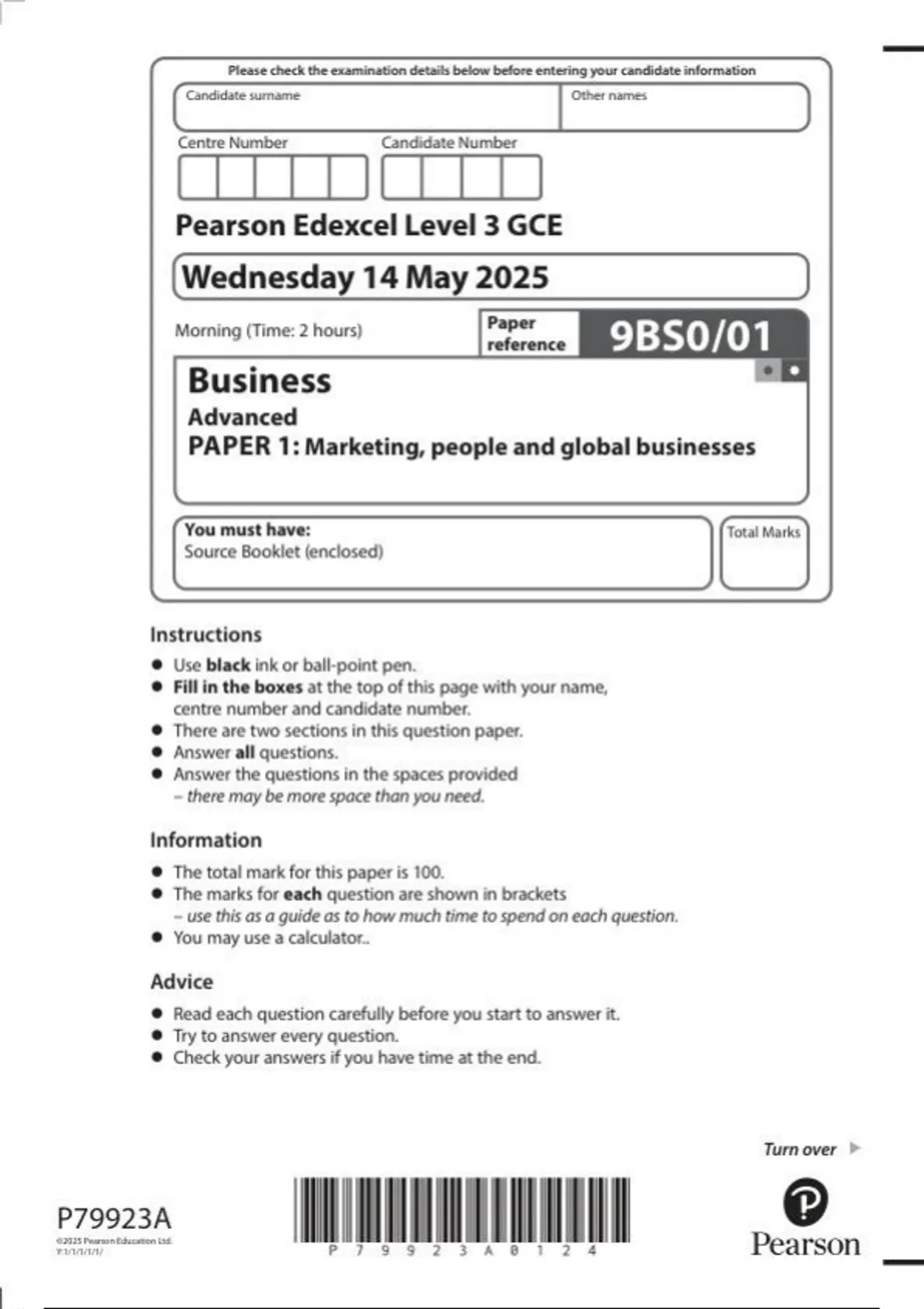 PEARSON EDEXCEL ADVANCED LEVEL BUSINESS PAPER 1 JUNE 2025 FINAL QUESTION PAPER