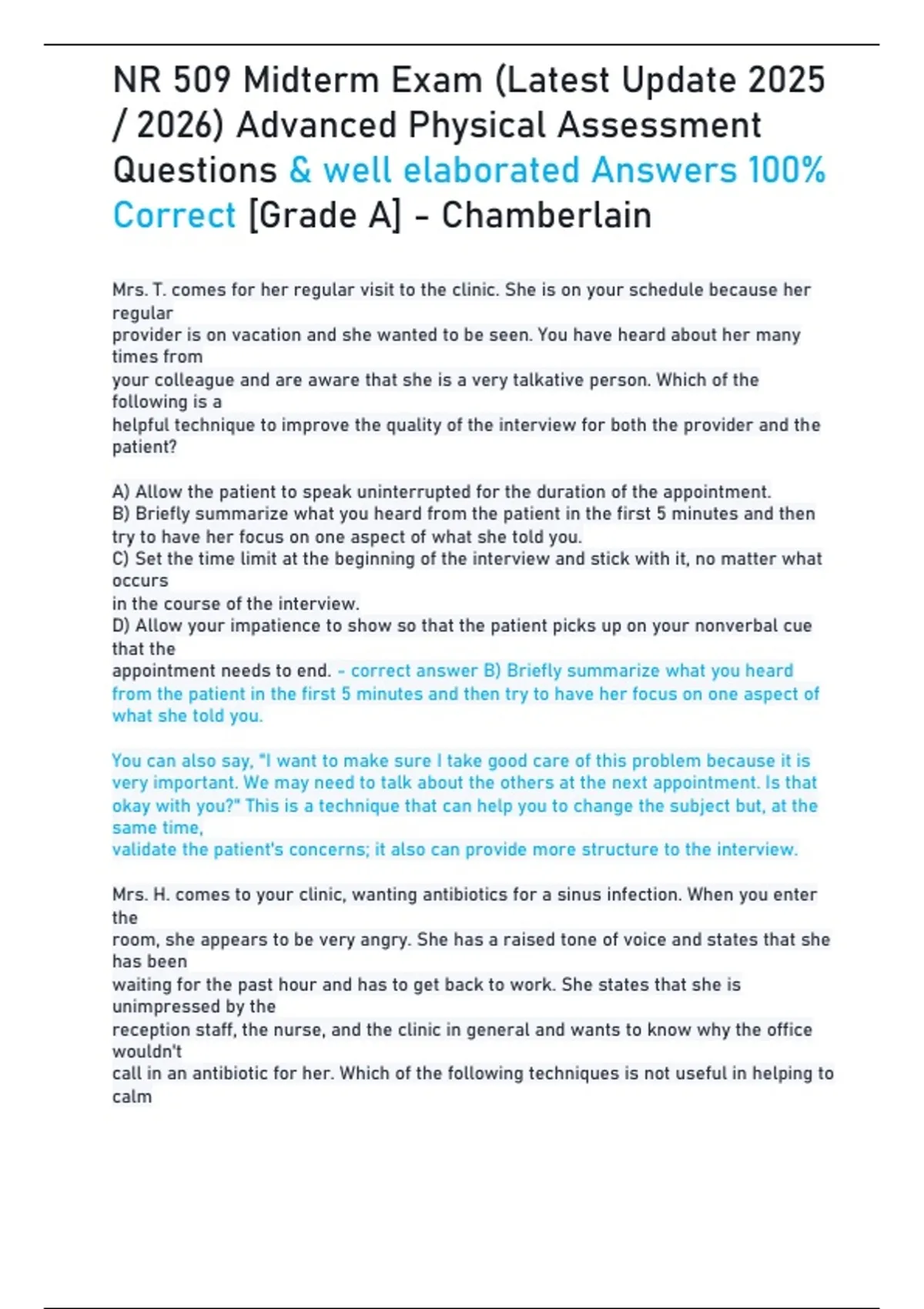 NR 509 Midterm Exam (Latest Update 2025 / 2026) Advanced Physical Assessment Questions &well elaborated Answers 100% Correct [Grade A]- Chamberlain