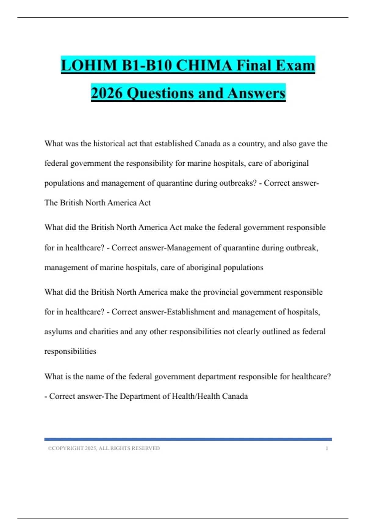 LOHIM B1-B10 CHIMA Final Exam 2026 Questions and Answers