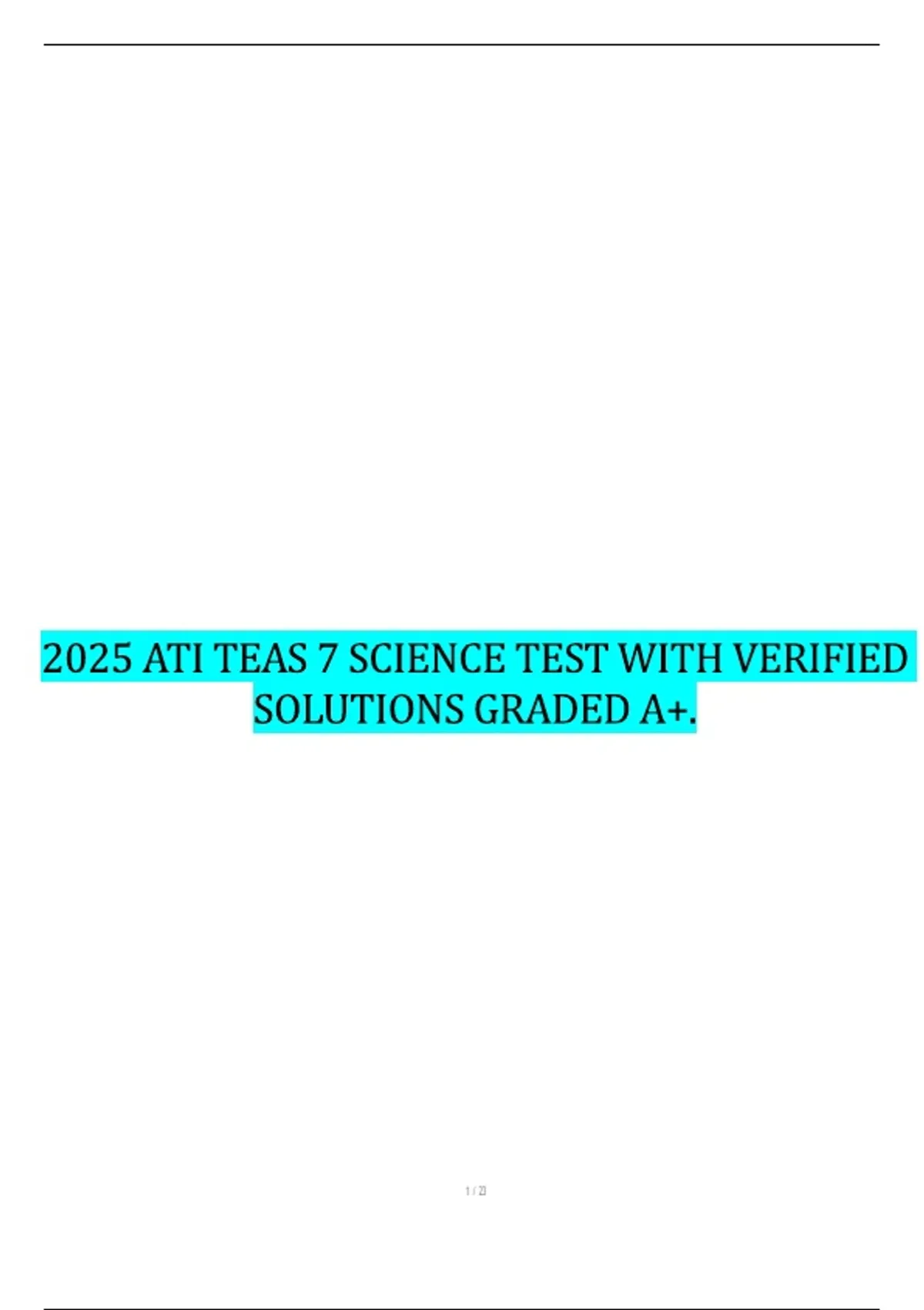This document provides a complete set of science test questions with verified solutions for the 2025 ATI TEAS 7 exam. It covers all major science domains, including human anatomy and physiology, biology, chemistry, and the scientific method. All solutions are verified and graded A+, making this an essential resource for students preparing to excel in the science portion of the TEAS 7 exam.