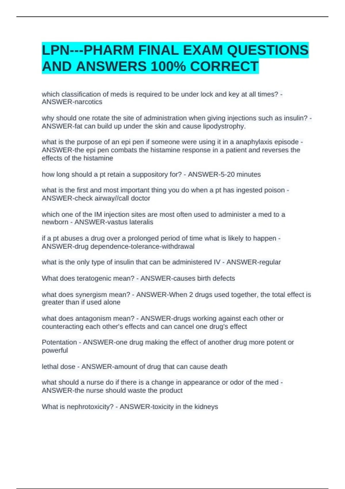 LPN---PHARM FINAL EXAM QUESTIONS AND ANSWERS 100% CORRECTLPN---PHARM FINAL EXAM QUESTIONS AND ANSWERS 100% CORRECTLPN---PHARM FINAL EXAM QUESTIONS AND ANSWERS 100% CORRECT which classification of meds is required to be under lock and key at all times? - ANSWER-narcotics why should one rotate the site of administration when giving injections such as insulin? - ANSWER-fat can build up under the skin and cause lipodystrophy. what is the purpose of an epi pen if someone were using it in a anaphylaxis episode - ANSWER-the epi pen combats the histamine response in a patient and reverses the effects of the histamine how long should a pt retain a suppository for? - ANSWER-5-20 minutes