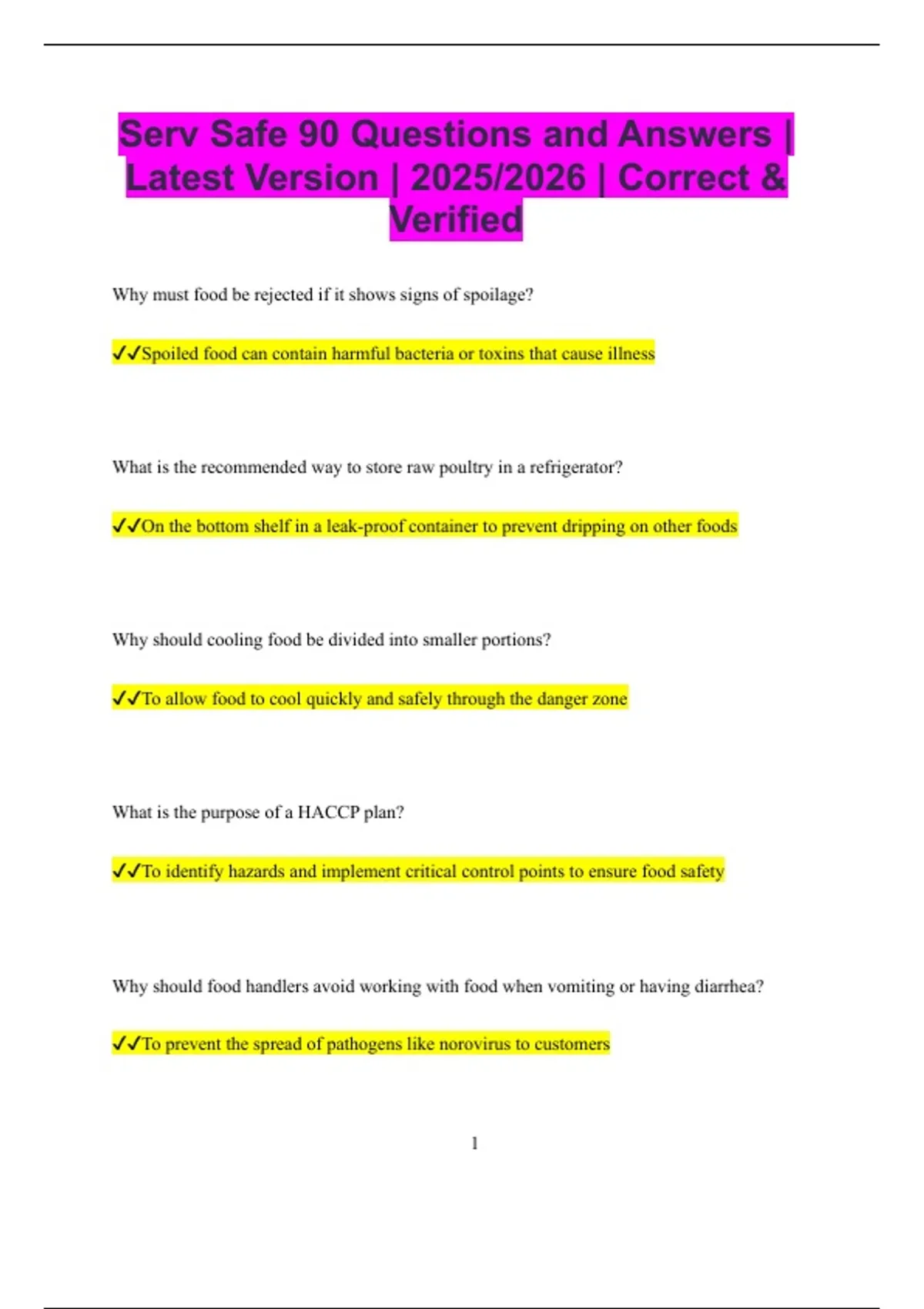 Serv Safe 90 Questions and Answers | Latest Version | 2025/2026 | Correct & Verified Why must food be rejected if it shows signs of spoilage? Spoiled food can contain harmful bacteria or toxins that cause illness What is the recommended way to store raw poultry in a refrigerator? On the bottom shelf in a leak-proof container to prevent dripping on other foods Why should cooling food be divided into smaller portions? To allow food to cool quickly and safely through the danger zone What is the purpose of a HACCP plan? To identify hazards and implement critical control points to ensure food safety Why should food handlers avoid working with food when vomiting or having diarrhea? To prevent the spread of pathogens like norovirus to customers 2 What is the correct way to sanitize a food-contact surface? Apply an approved sanitizer at the correct concentration for the recommended time Why should food handlers avoid touching ready-to-eat foods with bare hands? To prevent the transfer of pathogens from hands to food Why is it important to store raw meat separately from ready-to-eat foods in a refrigerator? To prevent cross-contamination from raw meat to foods that will not be cooked How should hands be washed properly in a foodservice operation? Use warm water, soap, scrub for at least 20 seconds, rinse, and dry with a single-use towel What is the main reason for cooling hot food quickly? To prevent the growth of bacteria by moving food through the temperature danger zone Why must food be labeled with the date it was prepared or opened? To ensure proper rotation and prevent serving spoiled or unsafe food 3 What is the first step in cleaning and sanitizing a food-contact surface? Remove food debris and wash the surface with soap and water Why should TCS (Time/Temperature Control for Safety) foods be monitored closely? Because they support rapid bacterial growth if not stored or cooked properly What is the correct way to thaw frozen food safely? In the refrigerator, under running water at 70°F (21°C) or below, or as part of the cooking process Why is personal hygiene critical in foodservice? Poor hygiene can introduce harmful pathogens into food and cause foodborne illness How can cross-contamination occur in a kitchen? By using the same cutting board or utensils for raw and ready-to-eat foods Why should gloves be changed frequently when handling food? To prevent contamination from one food or task to another 4 What is the danger zone in food temperature? Between 41°F (5°C) and 135°F (57°C) where bacteria grow rapidly Why should food be reheated to 165°F (74°C) before serving? To destroy any bacteria that may have grown during storage What is the main cause of Staphylococcus aureus food poisoning? Contamination of food by infected food handlers and improper temperature control Why must sick food handlers be excluded from work?