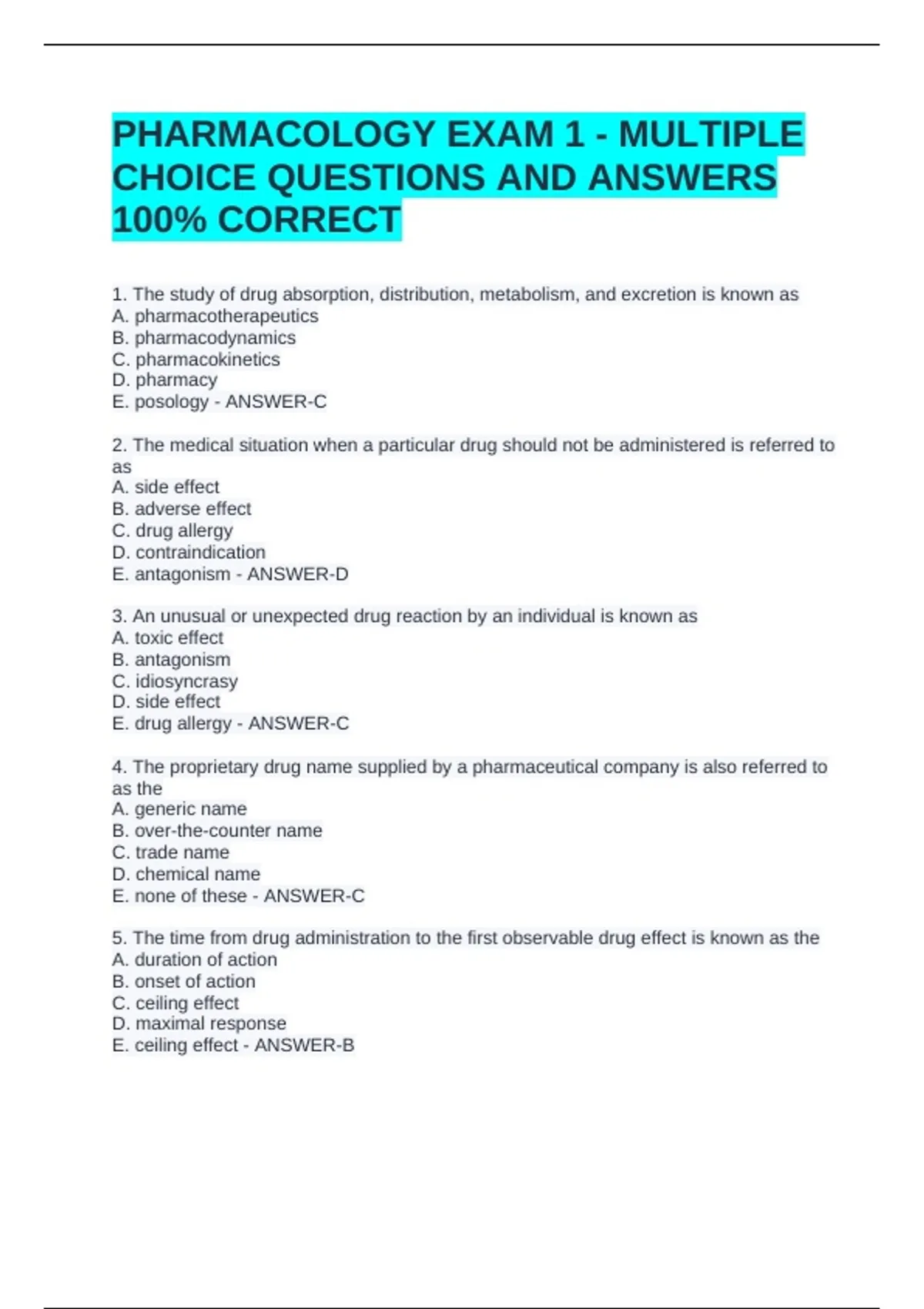 PHARMACOLOGY EXAM 1 - MULTIPLE CHOICE QUESTIONS AND ANSWERS 100% CORRECTPHARMACOLOGY EXAM 1 - MULTIPLE CHOICE QUESTIONS AND ANSWERS 100% CORRECTPHARMACOLOGY EXAM 1 - MULTIPLE CHOICE QUESTIONS AND ANSWERS 100% CORRECT 1. The study of drug absorption, distribution, metabolism, and excretion is known as A. pharmacotherapeutics B. pharmacodynamics C. pharmacokinetics D. pharmacy E. posology - ANSWER-C 2. The medical situation when a particular drug should not be administered is referred to as A. side effect B. adverse effect C. drug allergy D. contraindication E. antagonism - ANSWER-D 3. An unusual or unexpected drug reaction by an individual is known as A. toxic effect B. antagonism C. idiosyncrasy D. side effect