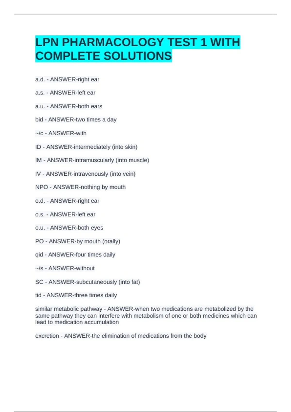 LPN PHARMACOLOGY TEST 1 WITH COMPLETE SOLUTIONSLPN PHARMACOLOGY TEST 1 WITH COMPLETE SOLUTIONSLPN PHARMACOLOGY TEST 1 WITH COMPLETE SOLUTIONS a.d. - ANSWER-right ear a.s. - ANSWER-left ear a.u. - ANSWER-both ears bid - ANSWER-two times a day