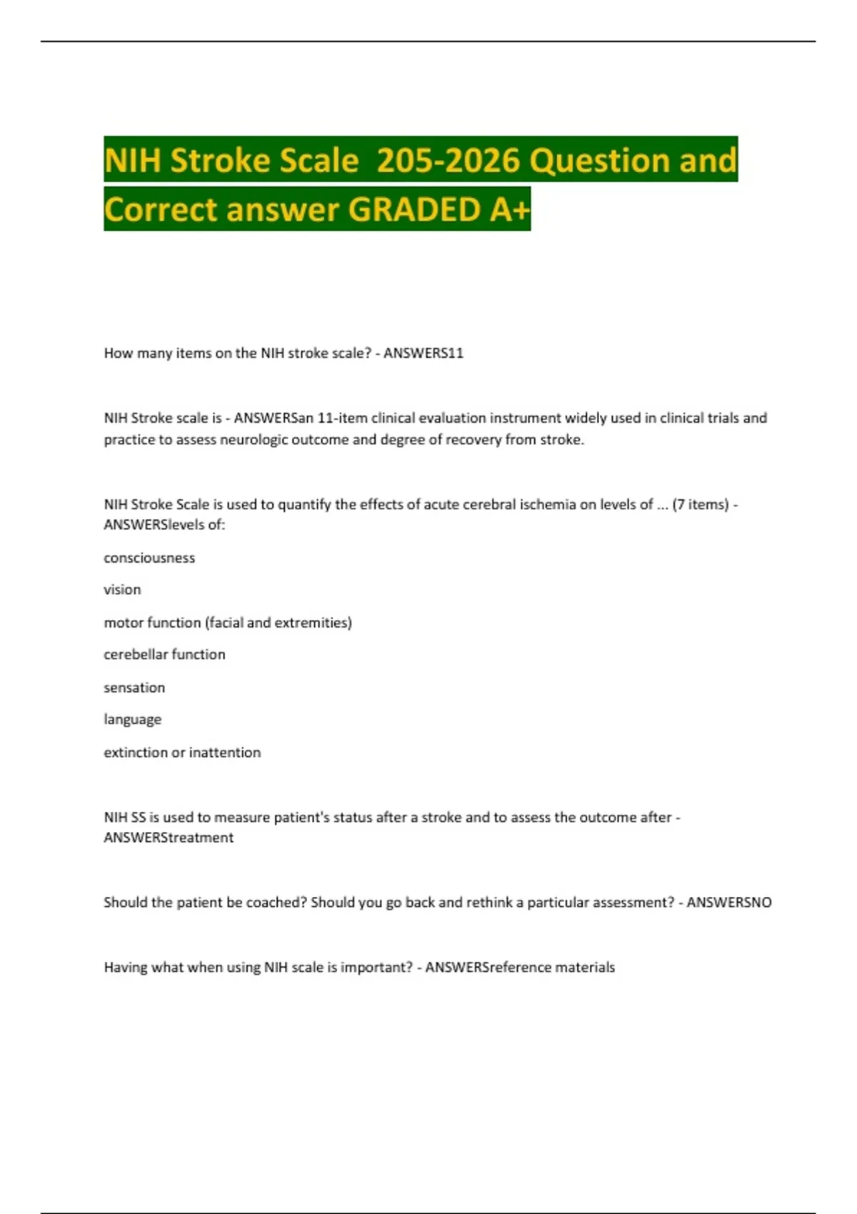 NIH Stroke Scale 205-2026 Question and Correct answer GRADED A+