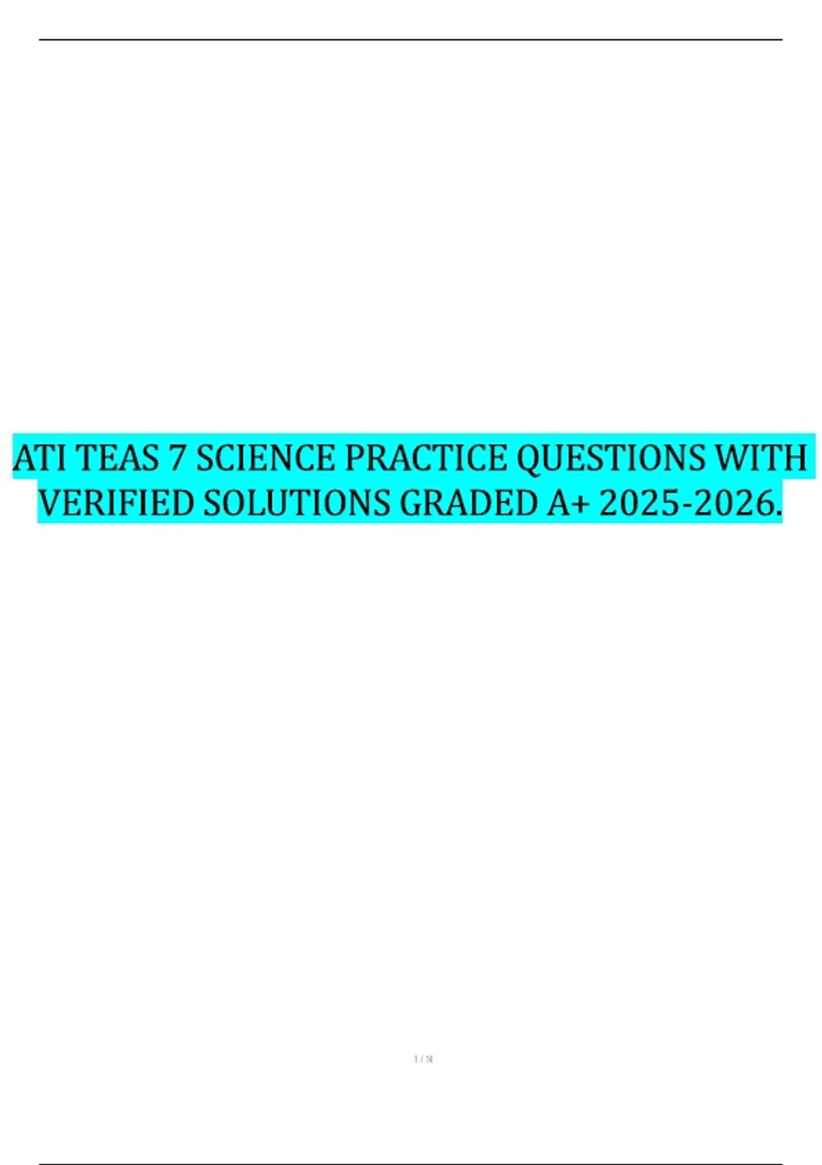 This document provides a complete set of practice questions for the ATI TEAS 7 Science section, updated for the 2025–2026 academic cycle. It includes verified solutions covering anatomy and physiology, biology, chemistry, physical sciences, and scientific reasoning. All solutions are graded A+, making this a reliable and high-quality resource for mastering the science portion of the TEAS 7 exam.