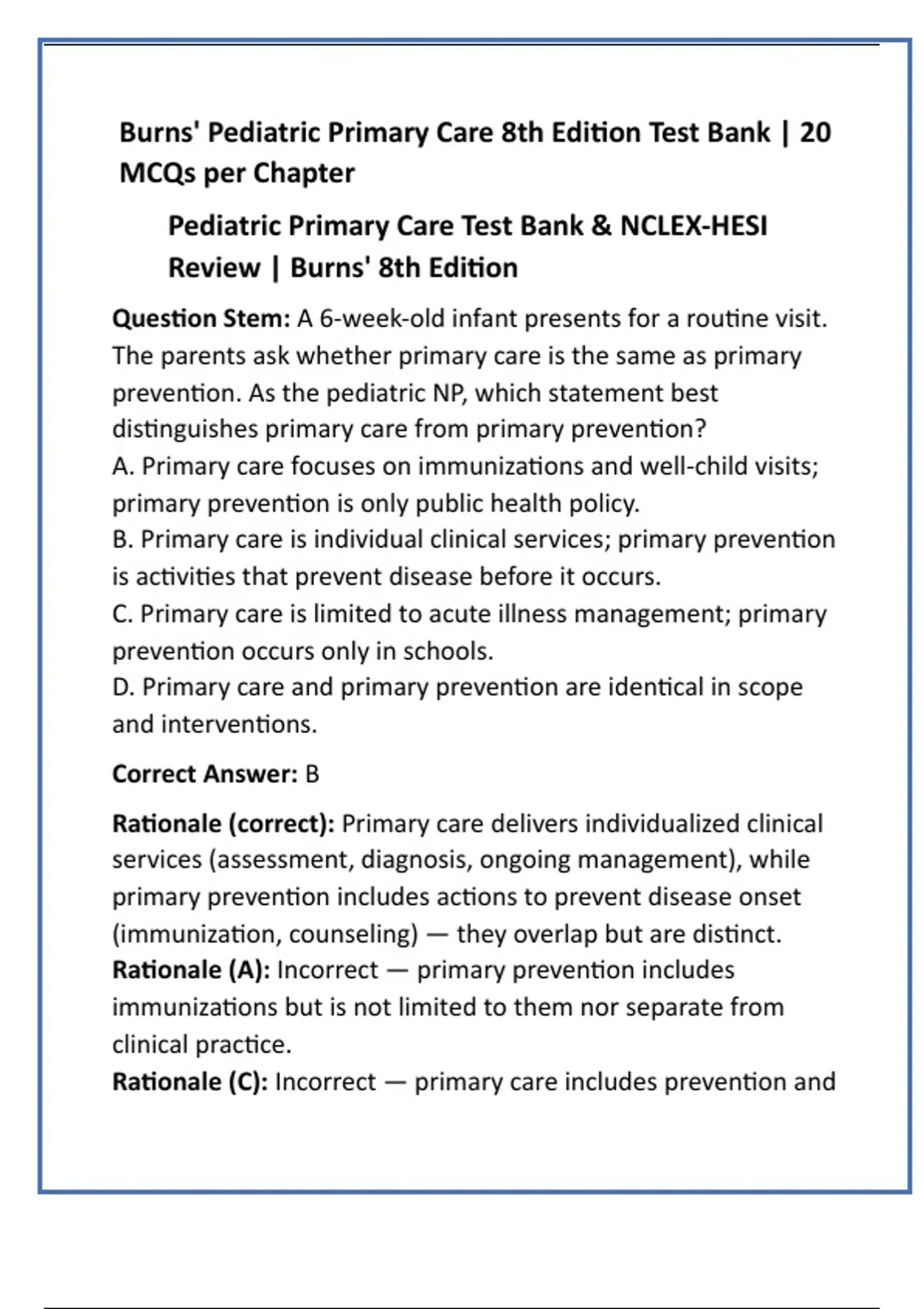 Rationale (C): Incorrect — primary care includes prevention and