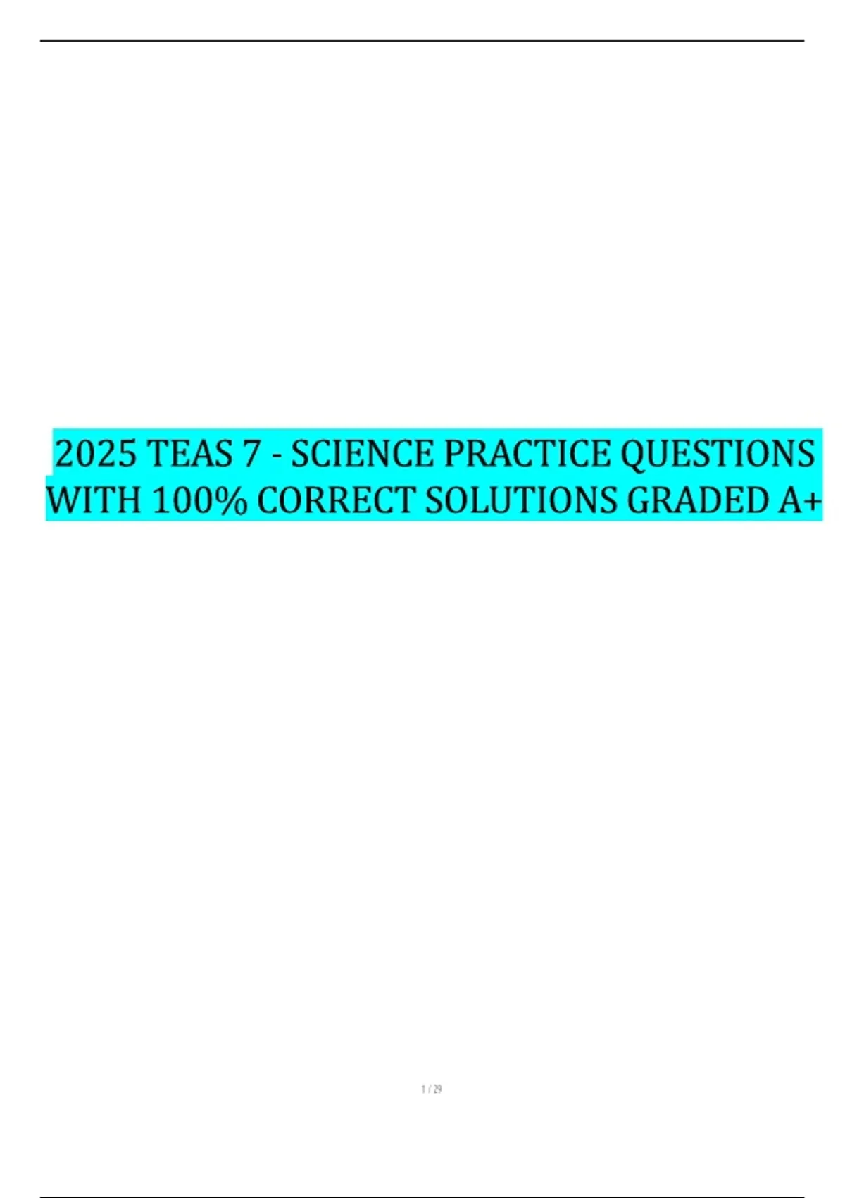 _______ INSTANT PDF DOWNLOAD_____ This document provides a comprehensive set of science practice questions for the 2025 TEAS 7 exam, with 100% correct solutions graded A+. It covers key areas of the science section, including anatomy and physiology, biology, chemistry, physical sciences, and scientific reasoning. All solutions are fully verified, making this a dependable and effective resource for preparing to achieve top results on the TEAS 7 Science exam.