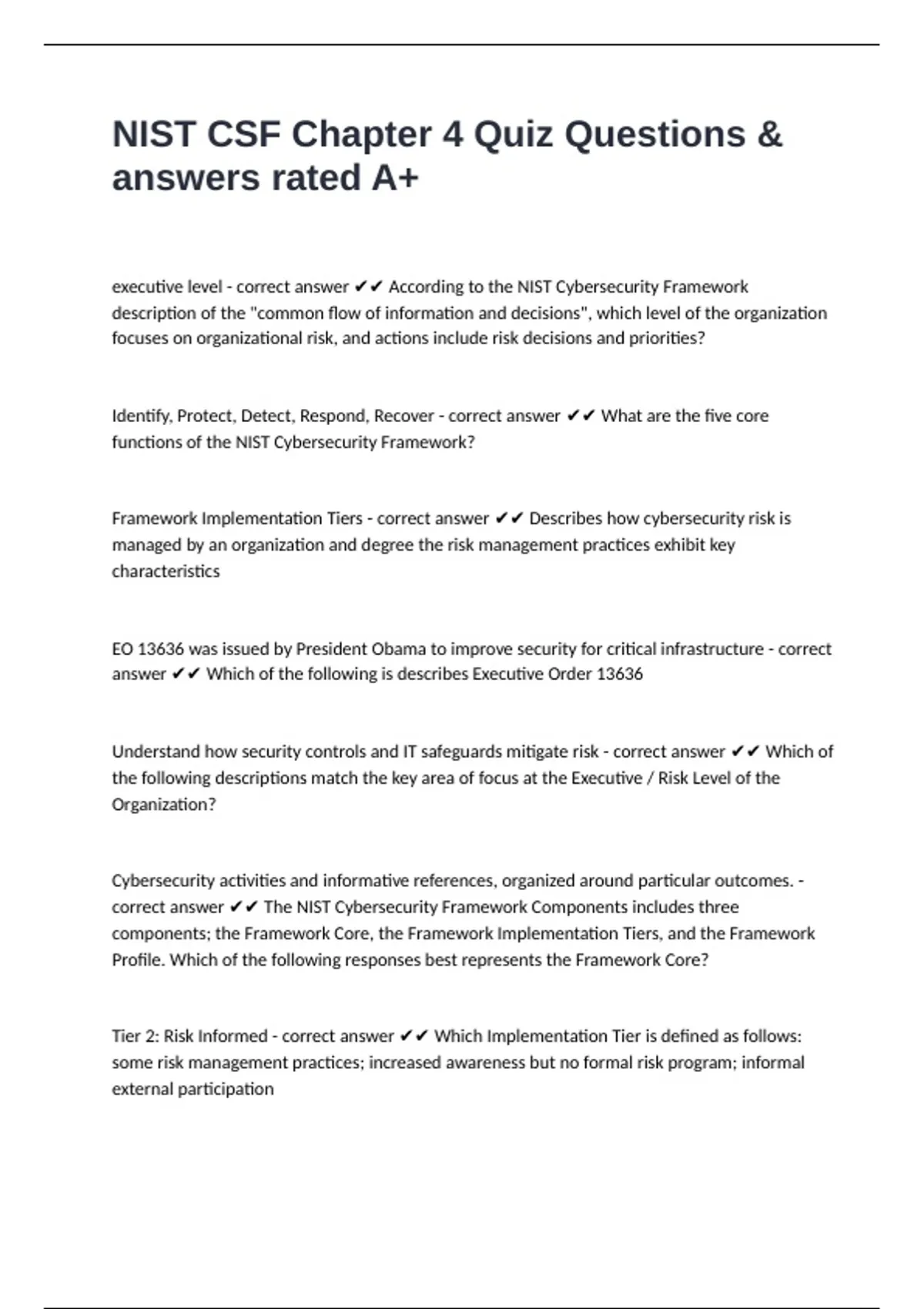 NIST CSF Chapter 4 Quiz Questions & answers rated A+