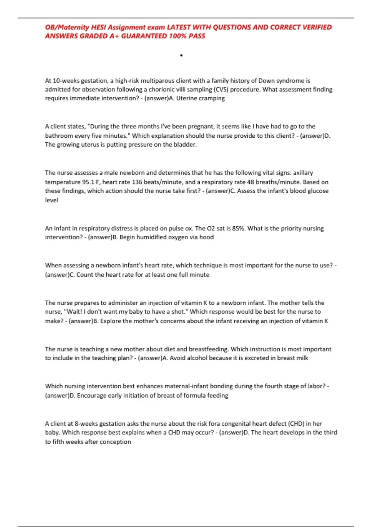 OB/Maternity HESI Assignment exam LATEST WITH QUESTIONS AND CORRECT VERIFIED ANSWERS GRADED A+ GUARANTEED 100% PASS