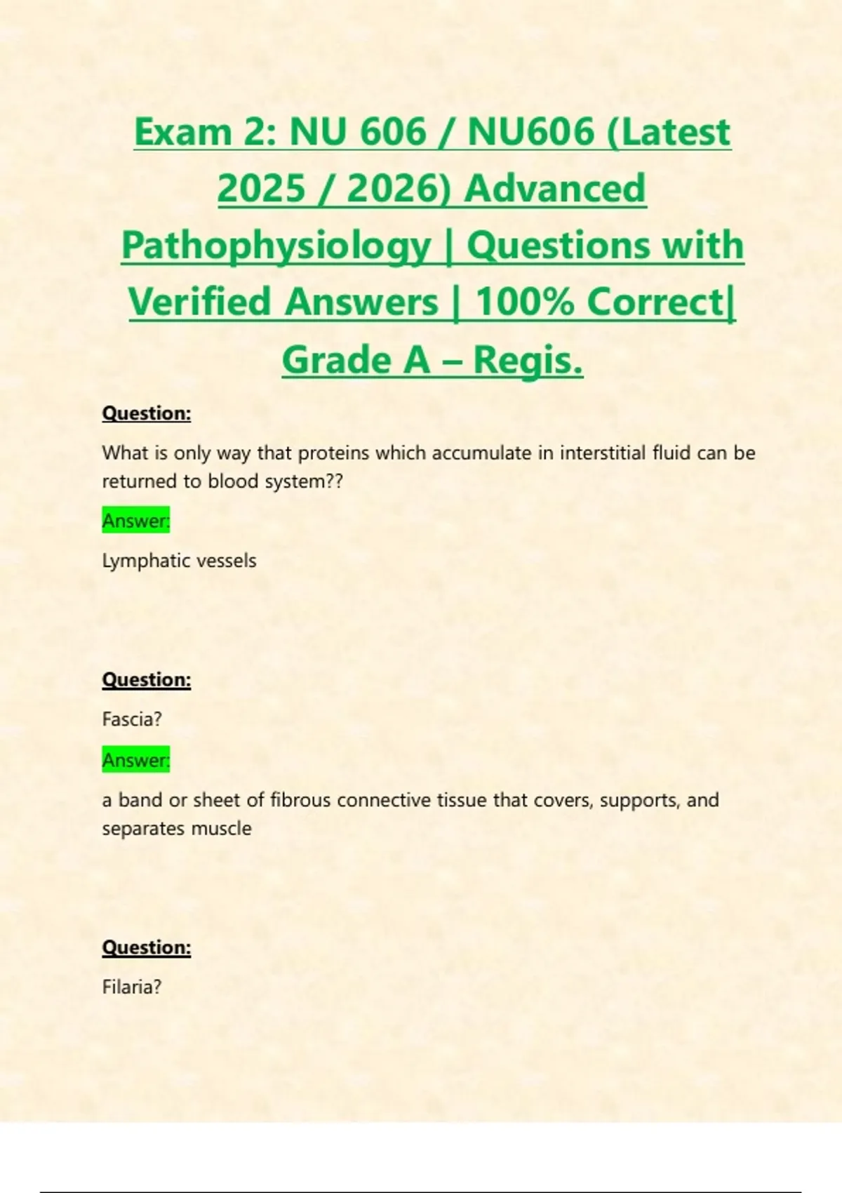 Exam 2: NU 606 / NU606 (Latest 2025 / 2026) Advanced Pathophysiology | Questions with Verified Answers | 100% Correct| Grade A – Regis.