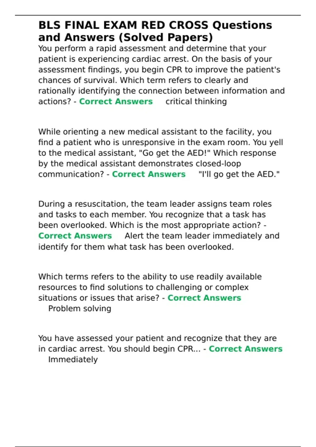 BLS FINAL EXAM RED CROSS Questions and Answers (Solved Papers)
