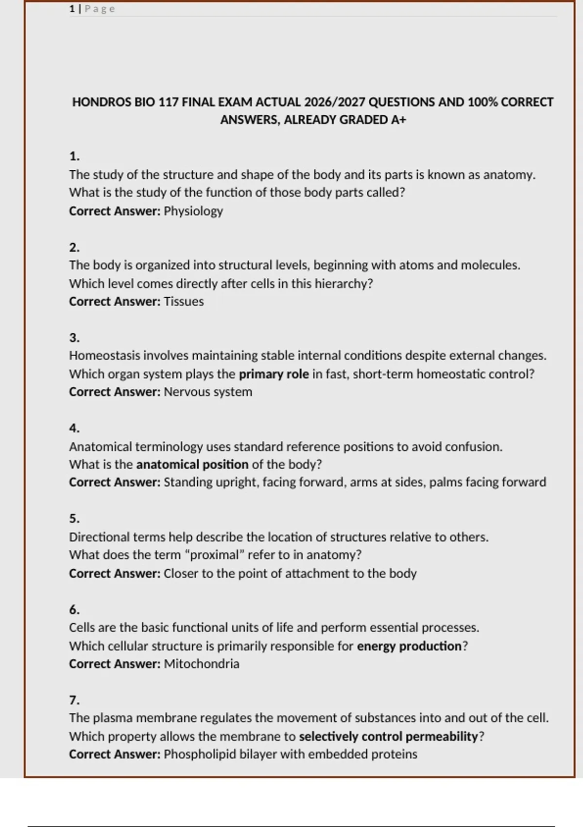 Prepare for the Hondros BIO 117 final exam with this comprehensive set of 150 realistic practice questions and correct answers. Covering anatomy, physiology, homeostasis, tissues, organ systems, and clinical applications, these exam-style questions help you master key concepts quickly and effectively. Ideal for nursing students and pre-health programs, this study resource focuses on the topics most commonly tested in BIO 117. Build confidence, reinforce your knowledge, and improve your exam performance with accurate, factual questions designed for 2025/2026 test prep. Perfect for final exam review, self-study, or structured anatomy and physiology practice sessions.