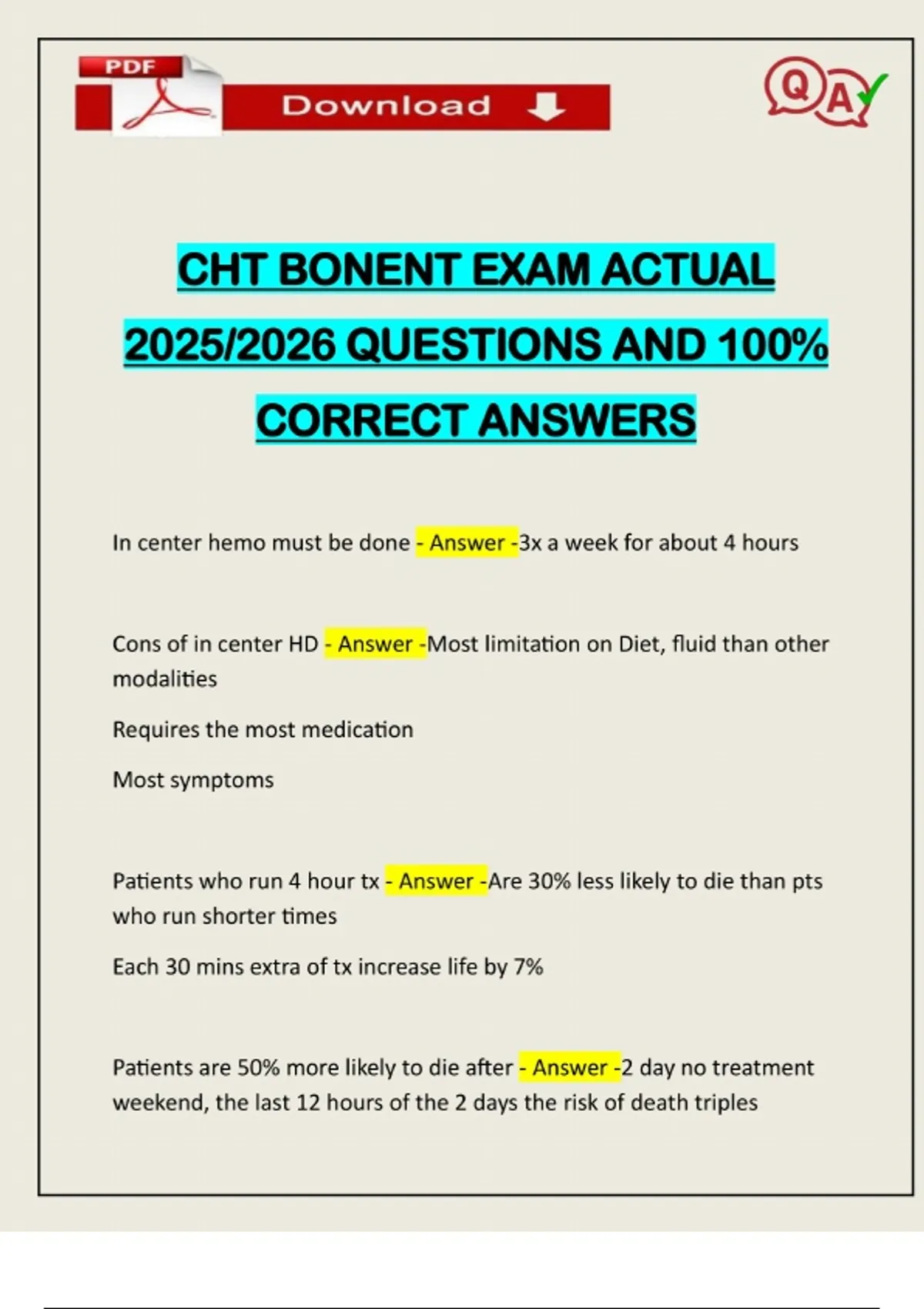 CHT BONENT EXAM ACTUAL 2025/2026 QUESTIONS AND 100% CORRECT ANSWERS In center hemo must be done - Answer -3x a week for about 4 hours Cons of in center HD - Answer -Most limitation on Diet, fluid than other modalities Requires the most medication Most symptoms Patients who run 4 hour tx - Answer -Are 30% less likely to die than pts who run shorter times Each 30 mins extra of tx increase life by 7% Patients are 50% more likely to die after - Answer -2 day no treatment weekend, the last 12 hours of the 2 days the risk of death triplesNeed assistance on Online classes, Exams & Assignments? Reach out for instant help!! Full Course Assistance, Plagiarism-free Essay Writing, Research Paper, Dissertation, Discussion Posts, etc…. Confidential & Secure services. Tutors are available for all subjects! Email now at: diastolic blood pressure - Answer -When the heart is at rest. Benefits of nocturnal in center - Answer -You get 2x as many txs as standard because it is longer and more gentle with fluid removal Rarely cramp Easy on heart