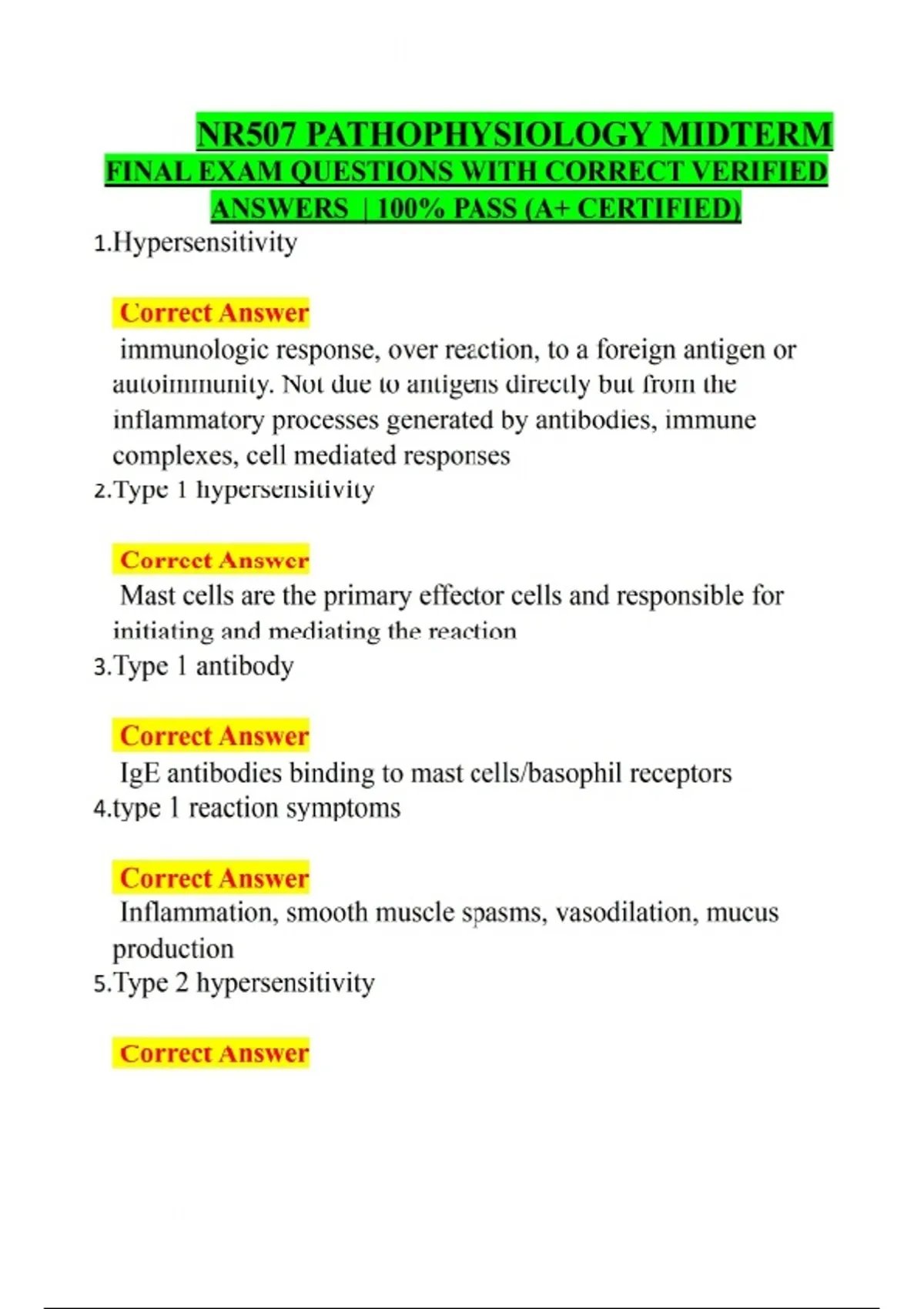 NR507 PATHOPHYSIOLOGY MIDTERM FINAL EXAM QUESTIONS WITH CORRECT VERIFIED ANSWERS | 100% PASS (A+ CERTIFIED) 1. Hypersensitivity Correct Answer immunologic response, over reaction, to a foreign antigen or autoimmunity. Not due to antigens directly but from the inflammatory processes generated by antibodies, immune complexes, cell mediated responses 2. Type 1 hypersensitivity Correct Answer Mast cells are the primary effector cells and responsible for initiating and mediating the reaction 3. Type 1 antibody Correct Answer IgE antibodies binding to mast cells/basophil receptors 4. type 1 reaction symptoms Correct Answer Inflammation, smooth muscle spasms, vasodilation, mucus production 5. Type 2 hypersensitivity Correct Answer IgG/IgM antibodies bind to antigens on surface of cell leading to cell destruction or malfunction, cytotoxic, immediate 6. Type 3 hypersensitivity Correct Answer Antibody binds to the antigen in the blood or body fluids then circulates to the tissues, IgG/IgM bind to free floating antigens forming immune complexes leading to tissue damage 7. type 4 hypersensitivity Correct Answer Delayed reaction, tissue damage, organ damage, mediated by T cells 8. ACID Correct Answer A- Allergic (I) C- Cytotoxic (II) I-Immune complex (III) D-Delayed (IV) 9. type 1 reaction examples Correct Answer allergic rhinitis, anaphylaxis, asthma 10. Type 2 reaction examples Correct Answer autoimmune hemolytic anemia, heparin induced thrombocytopenia, graves disease, myasthenia gravis, hemolytic transfusion reactions 11. Type 3 reaction examples Correct Answer systemic lupus, raynauds, serum sickness, arthus reaction 12. Type 4 reaction examples Correct Answer contact dermatitis, mycobacterial infection, graft rejection, TB skin tests, destruction of joints in rheumatoid arthritis 13. SLE exacerbation treatment Correct Answer IV fluids, immunotherapy injection, antipyretic, antibiotic, symptom managment 14. Human immunodeficiency Virus (HIV) Correct Answer CD4+ helper T cells become infected and destroyed. can lead to AIDS. Reverse transcriptase 15. HIV transmission routes Correct Answer Sex, blood, perinatal. high risk with anal sex 16.