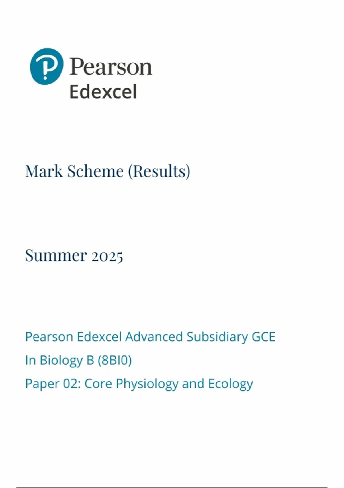 Pearson Edexcel As Level Biology B Mark Scheme Paper 2 2025 (8BI0/02: Core Physiology and Ecology)