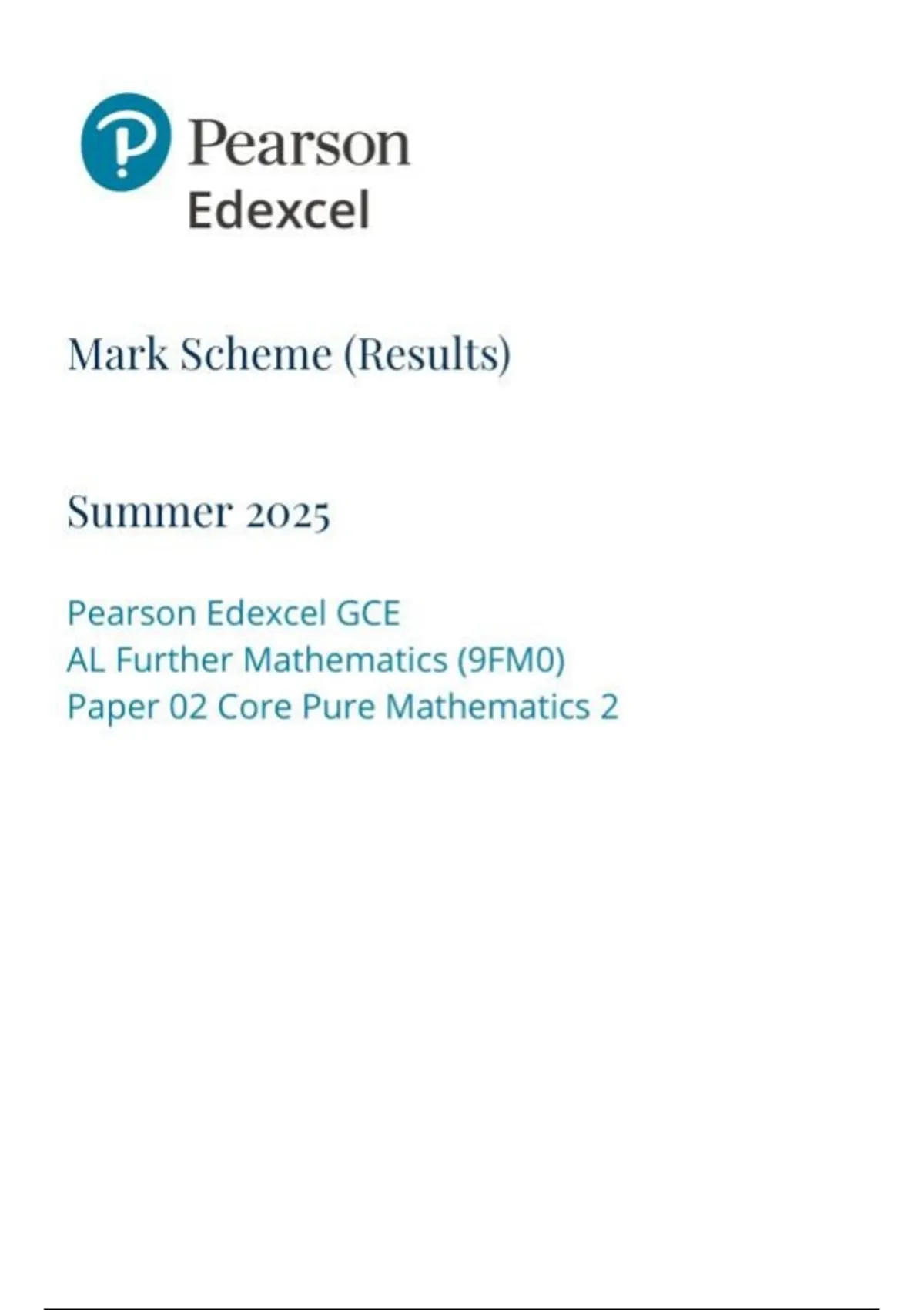 Pearson Edexcel GCE AL Further Mathematics (9FMО) Paper 02 Core Pure Mathematics 2 Marking scheme June 2025