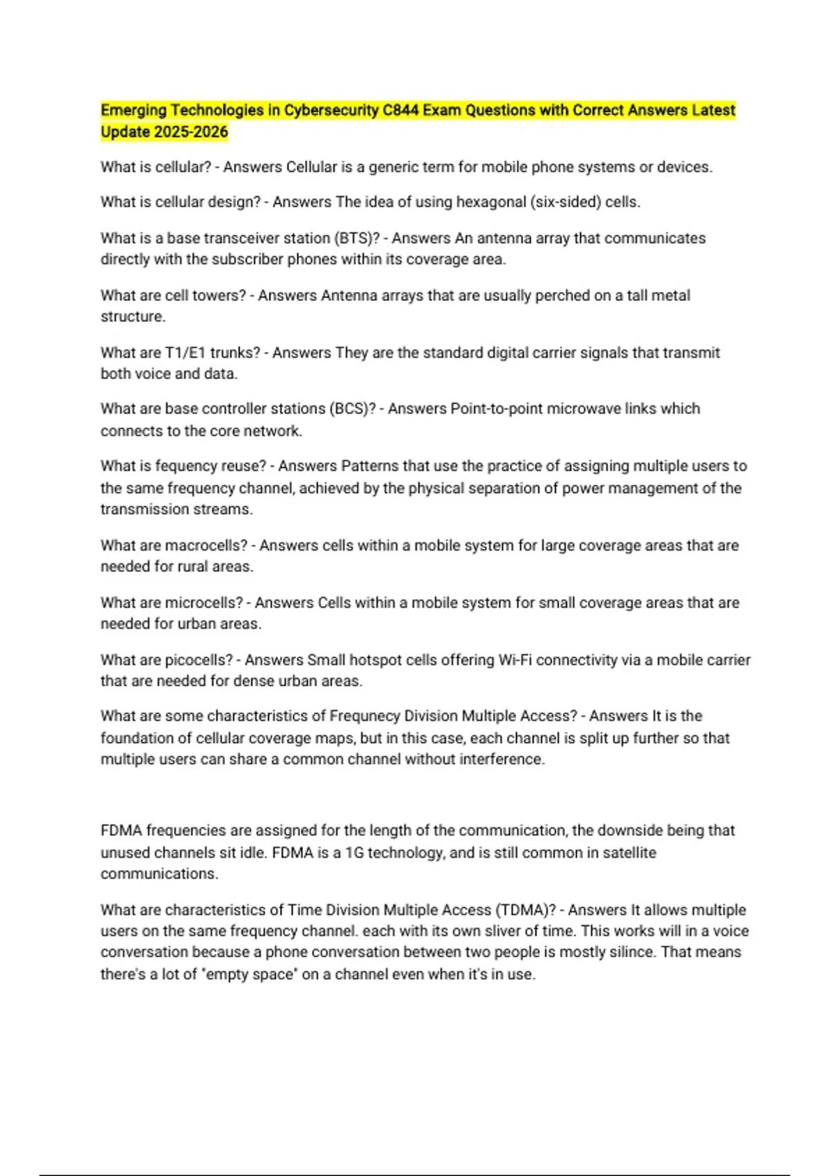 Emerging Technologies in Cybersecurity C844 Exam Questions with Correct Answers Latest Update What is cellular? - Answers Cellular is a generic term for mobile phone systems or devices. What is cellular design? - Answers The idea of using hexagonal (six-sided) cells. What is a base transceiver station (BTS)? - Answers An antenna array that communicates directly with the subscriber phones within its coverage area. What are cell towers? - Answers Antenna arrays that are usually perched on a tall metal structure. What are T1/E1 trunks? - Answers They are the standard digital carrier signals that transmit both voice and data. What are base controller stations (BCS)? - Answers Point-to-point microwave links which connects to the core network. What is fequency reuse? - Answers Patterns that use the practice of assigning multiple users to the same frequency channel, achieved by the physical separation of power management of the transmission streams. What are macrocells? - Answers cells within a mobile system for large coverage areas that are needed for rural areas. What are microcells? - Answers Cells within a mobile system for small coverage areas that are needed for urban areas. What are picocells? - Answers Small hotspot cells offering Wi-Fi connectivity via a mobile carrier that are needed for dense urban areas. What are some characteristics of Frequnecy Division Multiple Access? - Answers It is the foundation of cellular coverage maps, but in this case, each channel is split up further so that multiple users can share a common channel without interference. FDMA frequencies are assigned for the length of the communication, the downside being that unused channels sit idle. FDMA is a 1G technology, and is still common in satellite communications. What are characteristics of Time Division Multiple Access (TDMA)? - Answers It allows multiple users on the same frequency channel. each with its own sliver of time. This works will in a voice conversation because a phone conversation between two people is mostly silince. That means there's a lot of "empty space" on a channel even when it's in use. TDMA does not require high-performance filtering as FDMA does, but it does require very tight timing synchronization. TDMA helped bridge 1G technology to 2G and allowed for rapid subscriber expansion from the original analog cell systems to digitial without expensive upgrades to the system itself. What is Code Division Multiple Access (CDMA)? - Answers A 3G technology, it makes it possible for several users to share multiple frequency bands at the same time by spreading the signal out over the frequencies. This spread-spectrum technique uses codes to distinguish between connections. The wide bandwidths and improve power usage greatly reduce interfernce, and the coding allows multiple users to occupy the same channel at the same time. What is the handoff process? - Answers It occurs at the point when both neighbor frequency signals are at their lowest, usually at the border between two cells. What is the Advanced Mobile Phone System (AMPS)? - Answers It was deployed in North America in 1993. AMPS used analog signals to connect to cell towers, using FDMA for channel assignment. AMPS succeeded where previous attempts to create a commercial cellular service failed because of its ability to reuse frequencies (FDMA) and to hand off calls between cells in a relatively seamless way that did not involve the user. What is the Digital Advanced Mobile Phone System (D-AMPS)? - Answers 2G cellular phones and networks used TDMA, which greatly improved bandwidth efficiency and subscriber capacity. Unlike AMPS, which was essentially the same wywhere it was deployed, two distinct systems emerged for D-AMPS which were GSM and CDMA. What is the Global System for Mobile (GSM)? - Answers The use of GSM was mandated throughout Europe to ensure continent-wide compatibility between countries. What is the Short Message Service (SMS)? - Answers It was introduced to the world as texting. SMS did not seem like a compelling feature. But its use exploded with teens and young adults to the point where many used their phones only for texting. What is the Subscriber Identity Module (SIM) card? - Answers It is a small, detachable smart card that fits into a standardized card slot on the phone. It contains all the subscriber's information, as well as their contacts list. Not only did SIM cards help to address the 1G system's cloning vulnerability, they also allowed users to switch phones without carrier involvement. This led to the emergence of third-party phone retailers who could (and did) sell phones directly to consumers. What is the General Packet Radio Service (GPRS)? - Answers It was the first packet-switching technology method that allowed data sharing over mobile networks. Still considered a 2G technology but often called 2G+ or 2.5G, GPRS allowed access to some websites— although data rates proved to be too slow for what was becoming a growing need and expectation. What is EDGE? - Answers It was an AT&T rolled out service in 2003, and which other carriers quickly offered, represented an enhancement over GPRS. It offered high data rates through better data encoding and (at that time) viable data access to many websites. What about 3G? - Answers The most noticeable improvement in 3G was its high-speed data rates. One enhancement to 3G was a mobile protocol called High Speed Downlink Packet Access (HSDPA) which improved data rate to an impressive 14 Mbps. What is 4G? - Answers 4G is an all-IP network, allowing the use of ultra-broadband and the promise of 1 Gbps data rates. At that throughput level, voice communications can be converted to Voice over IP (VoIP) with high quality, high-definition TV can be streamed to mobile devices, and a host of live interactive gaming applications can be enjoyed. What are the two systems currently deployed for 4G? - Answers The two systems currently deployed for 4G are Mobile Worldwide Interoperabi
