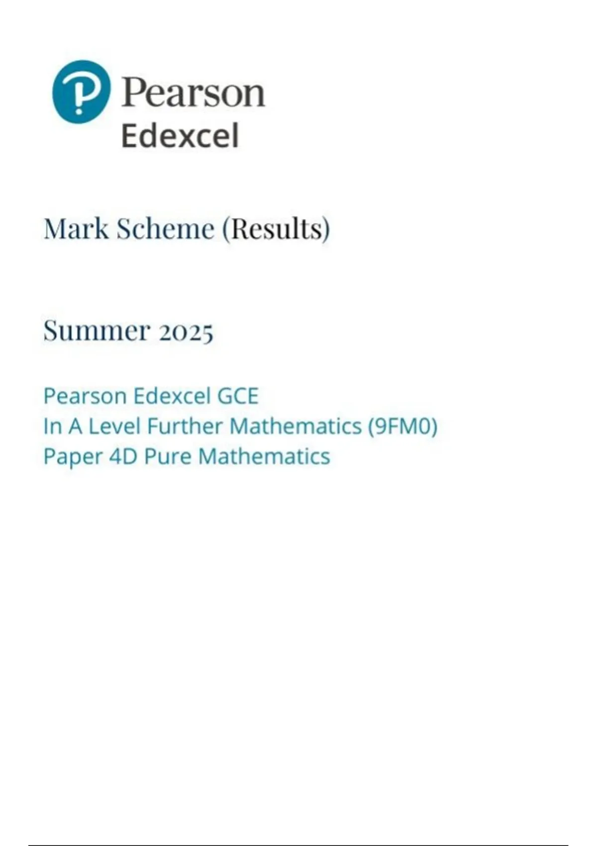 Pearson Edexcel GCE In A Level Further Mathematics (9FMO) Paper 4D Pure Mathematics marking scheme June 2025