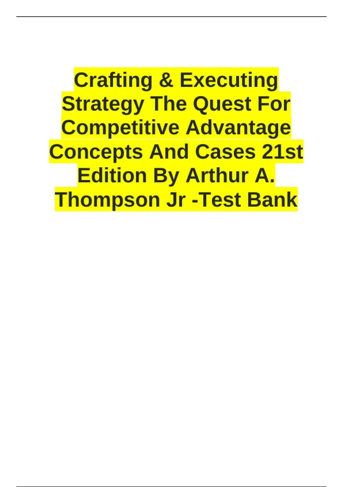 The Test Bank for Crafting and Executing Strategy: The Pursuit of Competitive Advantage—Concepts and Cases, 21st Edition, by Arthur A. Thompson Jr. is a comprehensive resource designed to support instructors and students in mastering the key concepts of strategic management. This test bank includes a wide range of carefully developed multiple-choice questions, true/false items, and application-based questions that align directly with the chapters of the textbook. Each question is structured to test understanding of strategic analysis, decision-making, competitive advantage, global strategy, and case applications. The test bank is organized by chapter, making it easy to integrate into lesson plans, assignments, and exams. This resource is ideal for educators who want ready-made, high-quality assessment materials and for students seeking to practice and reinforce their understanding of core strategy concepts.