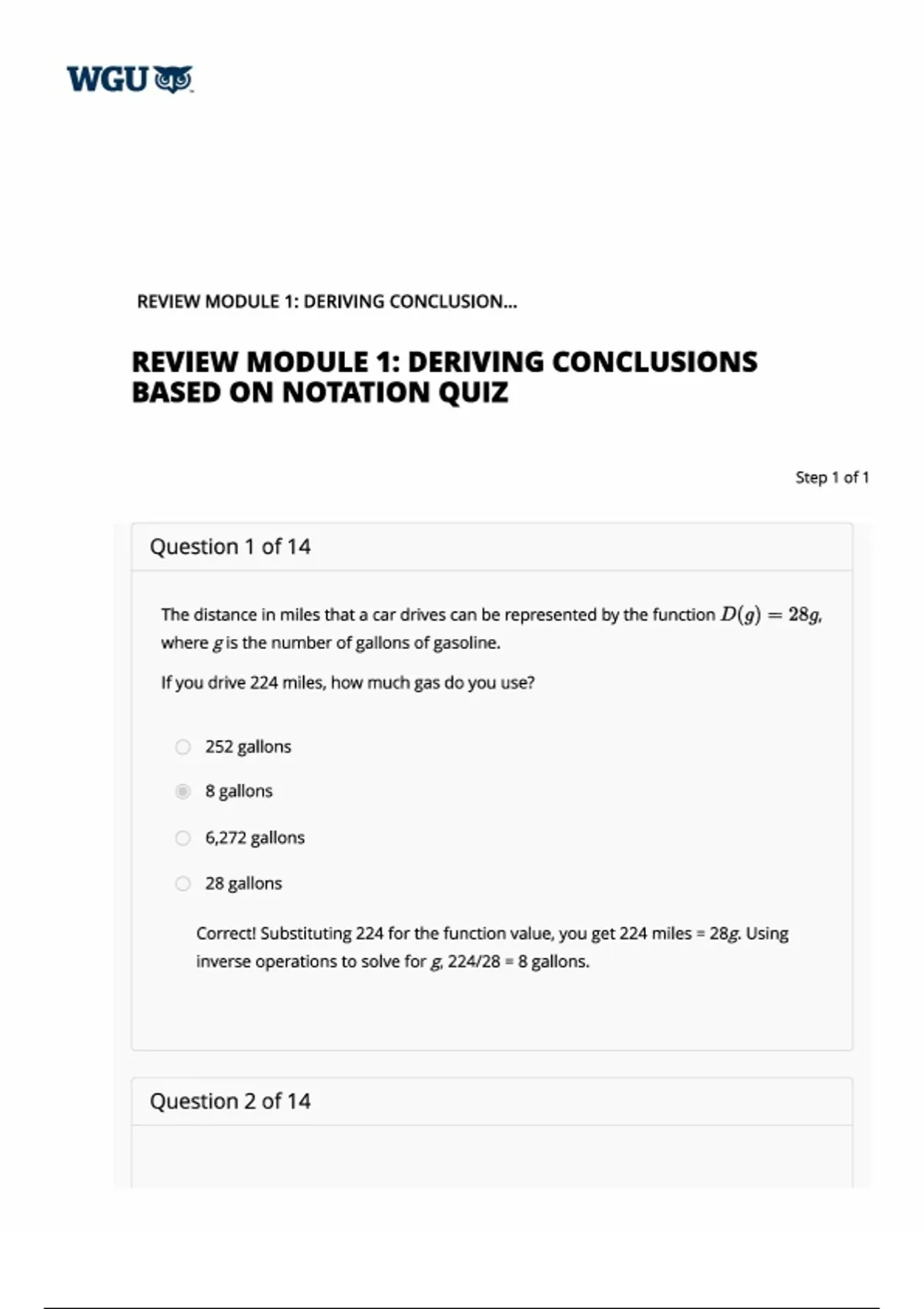 Correct! Substituting 224 for the function value, you get 224 miles = 28g. Using