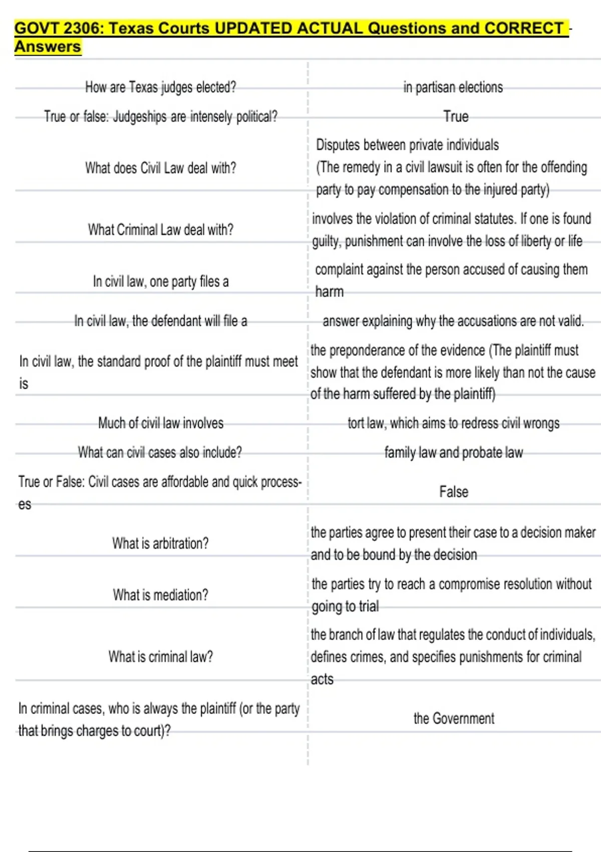 GOVT 2306: Texas Courts UPDATED ACTUAL Questions and CORRECT