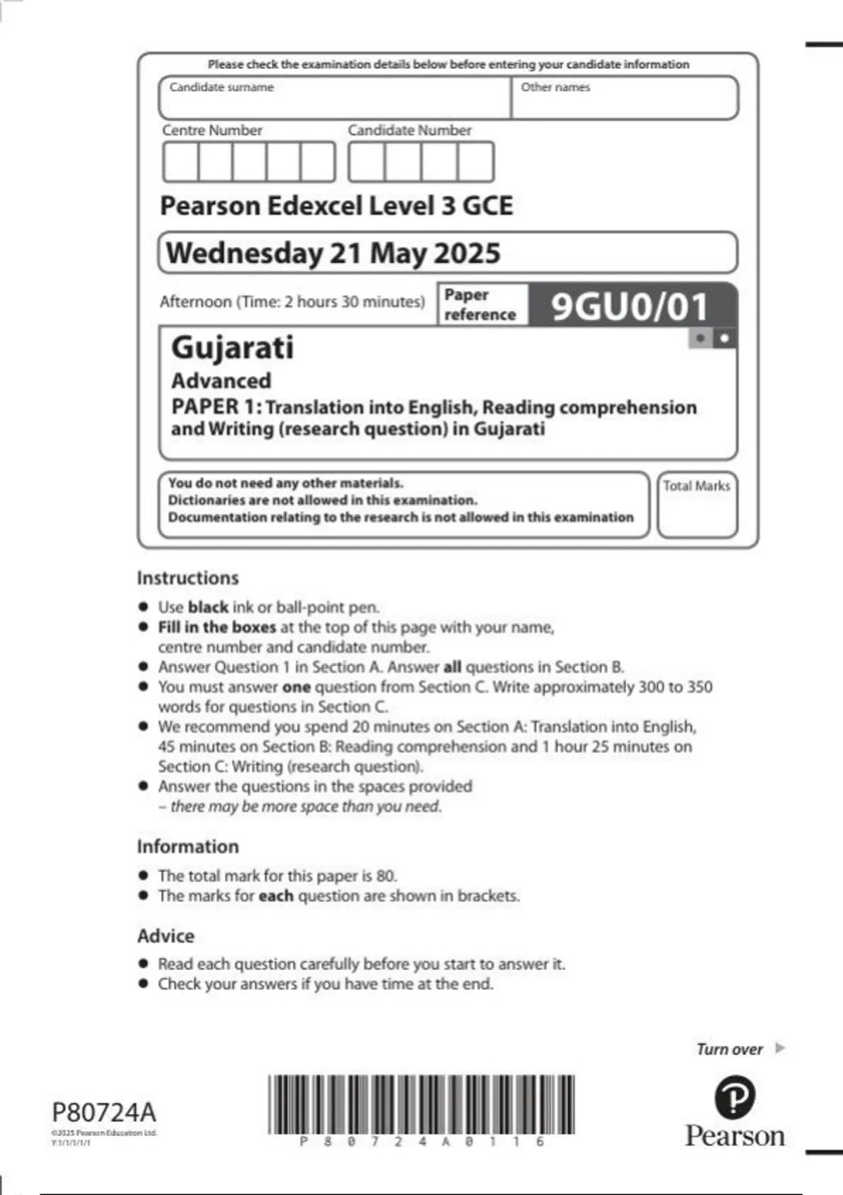 Pearson Edexcel Level 3 GCE Paper reference 9GU0/01 Gujarati Advanced PAPER 1: Translation into English, Reading comprehension and Writing (research question) in Gujarati June 2025