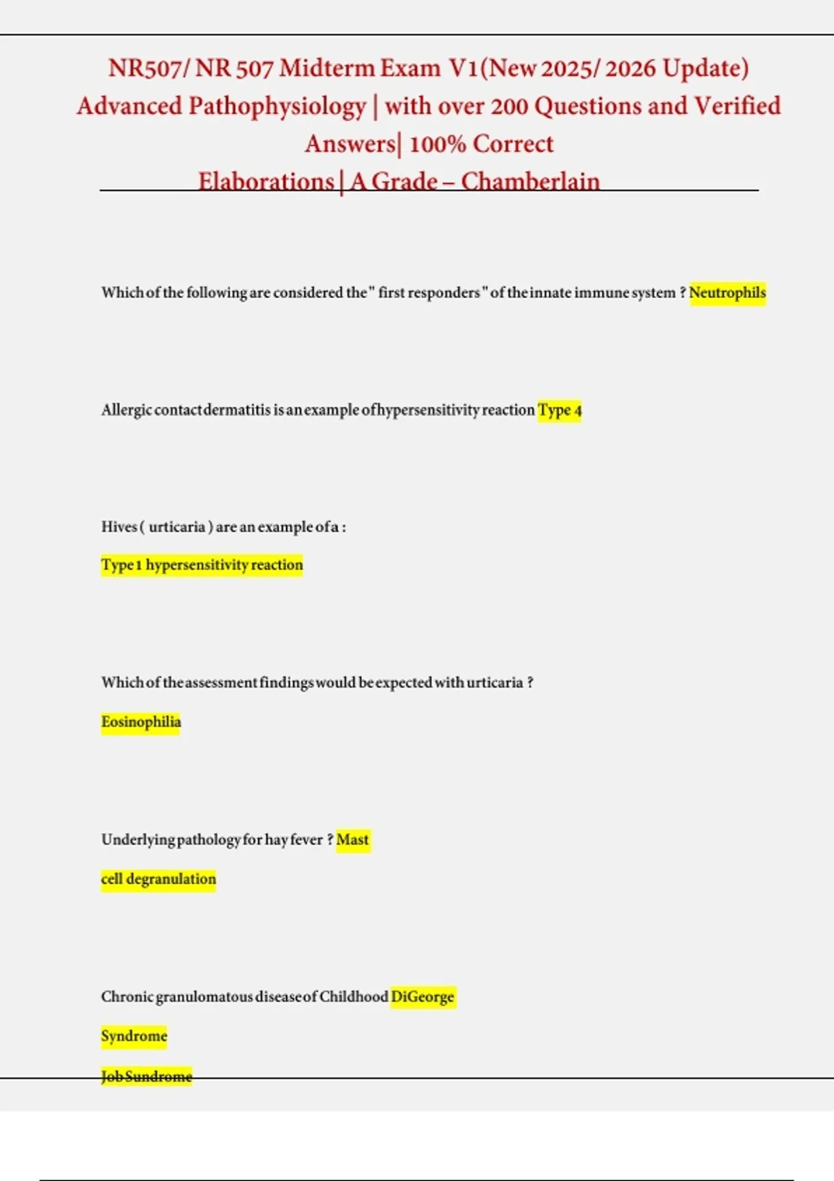 This document contains the complete NR507 Advanced Pathophysiology midterm exam from Chamberlain University for the academic year 2024/2025. It includes all exam questions with verified answers, ensuring 100% accuracy. The material is designed to help students prepare effectively for the midterm and achieve a top grade.