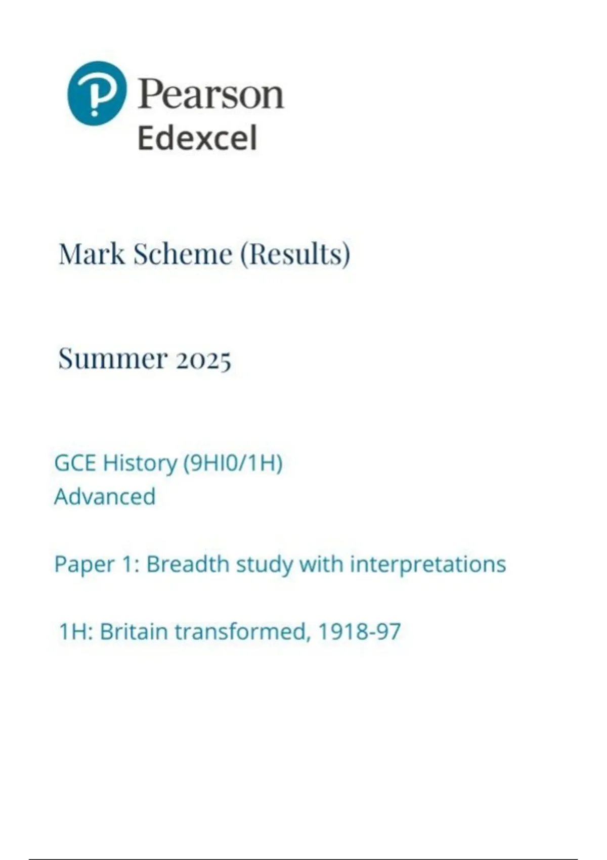 Pearson Edexcel GCE History (9HI0/1H) Advanced Paper 1: Breadth study with interpretations 1H: Britain transformed, 1918-97 Question paper and Marking scheme June 2025