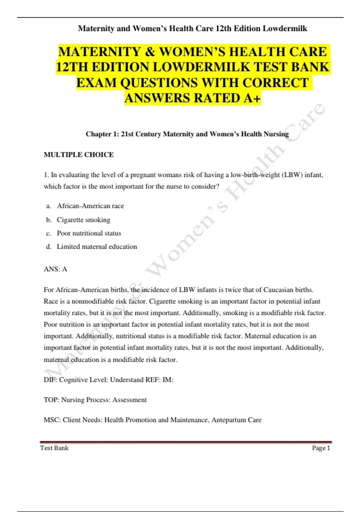 MATERNITY AND WOMEN’S HEALTH CARE 12TH EDITION LOWDERMILK TEST BANK EXAM QUESTIONS WITH CORRECT ANSWERS RATED A+ Chapter 01: 21st Century Maternity and Women’s Health Nursing Lowdermilk: Maternity & Women’s Health Care, 11th Edition MULTIPLE CHOICE 1. In evaluating the level of a pregnant woman’s risk of having a low-birth-weight (LBW) infant, which factor is the most important for the nurse to consider? a. African-American race b. Cigarette smoking c. Poor nutritional status d. Limited maternal education ANS: A For African-American births, the incidence of LBW infants is twice that of Caucasian births. Race is a nonmodifiable risk factor. Cigarette smoking is an important factor in potential infant mortality rates, but it is not the most important. Additionally, smoking is a modifiable risk factor. Poor nutrition is an important factor in potential infant mortality rates, but it is not the most important. Additionally, nutritional status is a modifiable risk factor. Maternal education is an important factor in potential infant mortality rates, but it is not the most important. Additionally, maternal education is a modifiable risk factor. DIF: Cognitive Level: Understand REF: p. 6 TOP: Nursing Process: Assessment MSC: Client Needs: Health Promotion and Maintenance, Antepartum Care 2. What is the primary role of practicing nurses in the research process? a. Designing research studies b. Collecting data for other researchers c. Identifying researchable problems d. Seeking funding to support research studies ANS: C When problems are identified, research can be properly conducted. Research of health care issues leads to evidence-based practice guidelines. Designing research studies is only one factor of the research process. Data collection is another factor of research. Financial support is necessary to conduct research, but it is not the primary role of the nurse in the research process. DIF: Cognitive Level: Understand REF: p. 14 TOP: Nursing Process: N/A MSC: Client Needs: Safe and Effective Care Environment 3. A 23-year-old African-American woman is pregnant with her first child. Based on the statistics for infant mortality, which plan is most important for the nurse to implement? a. Perform a nutrition assessment. b. Refer the woman to a social worker. c. Advise the woman to see an obstetrician, not a midwife. d. Explain to the woman the importance of keeping her prenatal care appointments. ANS: D