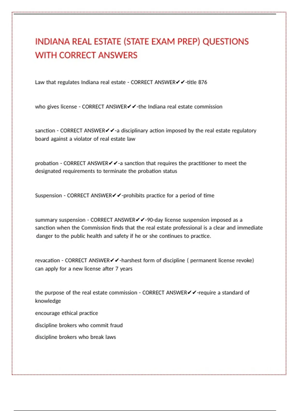 INDIANA REAL ESTATE (STATE EXAM PREP) QUESTIONS