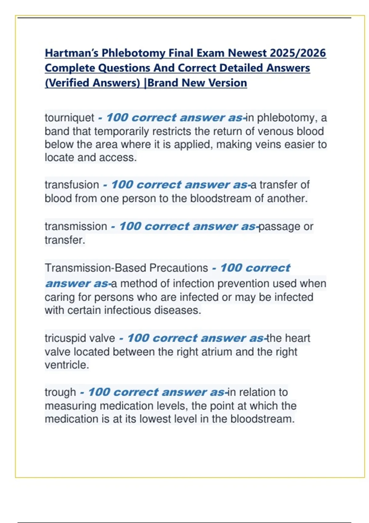 Hartman’s Phlebotomy Final Exam Newest 2025/2026