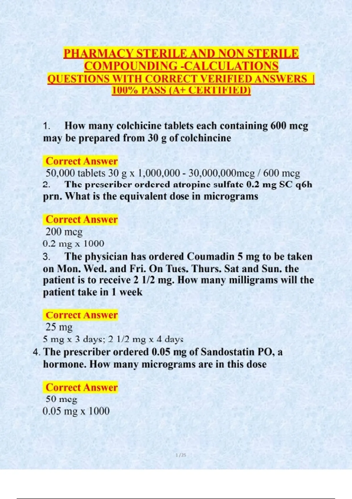 . How many colchicine tablets each containing 600 mcg may be prepared from 30 g of colchincine Correct Answer 50,000 tablets 30 g x 1,000,000 - 30,000,000mcg / 600 mcg 2. The prescriber ordered atropine sulfate 0.2 mg SC q6h prn. What is the equivalent dose in micrograms Correct Answer 200 mcg 0.2 mg x 1000 3. The physician has ordered Coumadin 5 mg to be taken on Mon, Wed, and Fri. On Tues, Thurs, Sat and Sun, the patient is to receive 2 1/2 mg. How many milligrams will the patient take in 1 week Correct Answer 25 mg 5 mg x 3 days; 2 1/2 mg x 4 days 4. The prescriber ordered 0.05 mg of Sandostatin PO, a hormone. How many micrograms are in this dose Correct Answer 50 mcg 0.05 mg x 1000 2 / 25 5. You have a 2-mL ampule of caffeine. Na benzonatate containing gr viiss. If the physican orders gr v, how many milliliters will you dispense Correct Answer 1.33 mL V= 5; VIISS = 7.5 7.5gr/2 mL = 5 gr/ XmL 6. How many grams of reserpine would be required to make 25,000 tablets, each containing 250 mcg of reserpine Correct Answer 6.25g 250 mcg/tablet x 25,000 tablets 1,000,000 mcg/g 7. How many milligrams are in one tablet of Nitrostat 1/150 gr Correct Answer 0.4 mg 1 gr is 65 mg 65 mg/1gr = xmg/ 1/150 gr 8. How many grams of antipyrine should be used in preparing the following prescription? Rx Antipyrine 5% Glycerin Ad 60 Correct Answer 3.0 g of antipyrine FV - FS = IV - IS .05 x 60 g 9. A pediatric patient is to be given a 70-mg dose of Dilantin by administration of an oral suspension containing 50 mg of Dilantin per 5 mL. How many milliliters of the suspension must be administered Correct Answer 7 mL 3 / 25 50 mg / 5 mL = 70 mg / X mL 10. A prefilled syringe of furosemide contains 20 mg of drug in 2 mL of solution. How many micrograms of drug would be administered by an injection of 0.5 mL of the solution Correct Answer 5000 mcg 20 mg / 2 mL - X mg / 0.5 mL x 1000 11. The usual dose range of dimercaprol is 2.5 mg to 5 mg/kg of body weight. What would be the dose range for a person weighing 165 lb Correct Answer 187.5 to 375 mg 165 / 2.2 = 75 x 2.5 mg- 75 x 5 mg 12. How many chloramphenicol capsules each containing 250 mg of chloramphenicol are needed to provide 25 mg/kg/day of body weight for 1 week for a person weighing 154 lb Correct Answer 49 capsules 154 / 2.2 X 25mg X 7 days / 250 mg per capsule 13. Cyclosporine is an immunosuppressive agent administered before and after organ transplantation at a single dose of 15 mg/kg. How many milliliters OF A 50-mL BOTTLE containing 100 mg of cyclosporine per milliliter would be administered to a 140 lb kidney transplant patient Correct Answer 9.54 mL 4 / 25 140 / 2.2 = 63.63 X 15 mg = 954.54 100 mg/ mL = 954.54 / X mL 14. How many milliliters of aminophylline injection containing 250 mg in each 10 mL should be used in filling a medication order calling for 15 mg of aminophylline Correct Answer 0.6 mL 250 mg / 10 mL = 15 mg/ X mL 15. The dose of a drug is 500 mcg/kg of body weight. How many milligrams should be given to a child weighing 55 lb. Correct Answer 12.5 mg 55 / 2.2 x 500 mcg / 1000 16. The antiviral ophthalmic drug fomivirsen sodium (Vitravene) has been ordered by the physician 330 mcg. The vial is labeled 6.6 mg/mL. How many milliliters contain the prescribed dose Correct Answer 0.05 mL 330 mcg / 1000 6.6 mg/ mL = 0.660mg / X mL 17. The physician ordered 0.725 mg of droperidol (Inapsine) IV stat. The vial reads 2.5 mg in 2 mL. Calculate the amount of drug you will administer to this patient in milliliters. Correct Answer 0.58 mL 2.5 mg / 2 mL - 0.725 mg / X mL 5 / 25 18. a Patient is to receive a 100-mg dose of gentamicin. The medication is available in an 80-mg/mL vial. How many milliliters should the patient receive Correct Answer 1.2 mL 80mg/mL = 100 mg/ X mL 19. A drug has a concentration of 20 mg/mL. How many grams of the drug are in 1/2 L of the solution Correct Answer 10 g 20 mg / 1000 0.5 mL x 1000 0.02g / 1 mL = Xg / 500 mL 20. A dose of antacid is 1 tbsp. How many doses can be prepared from a pint bottle Correct Answer