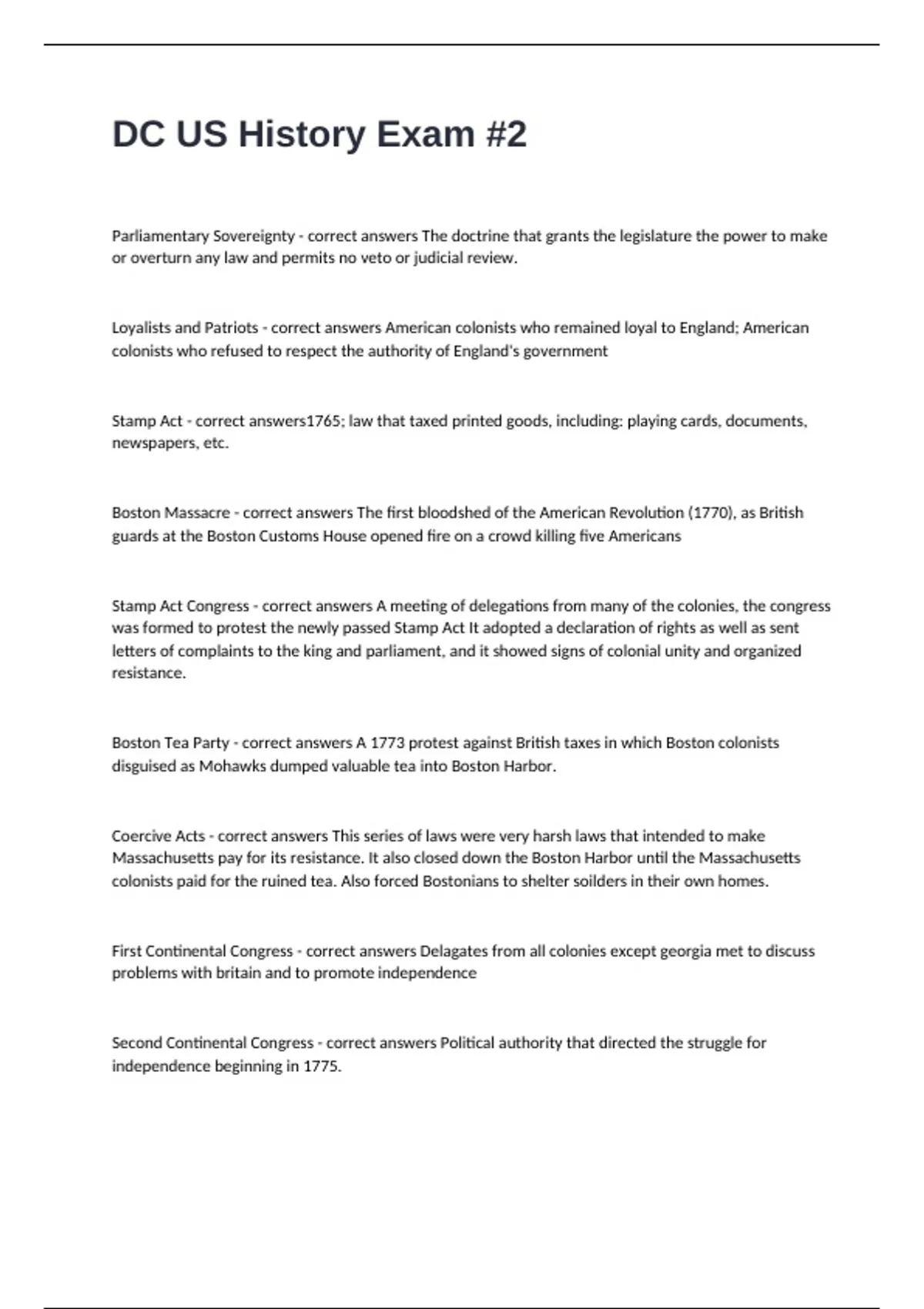 Coercive Acts - correct answers This series of laws were very harsh laws that intended to make