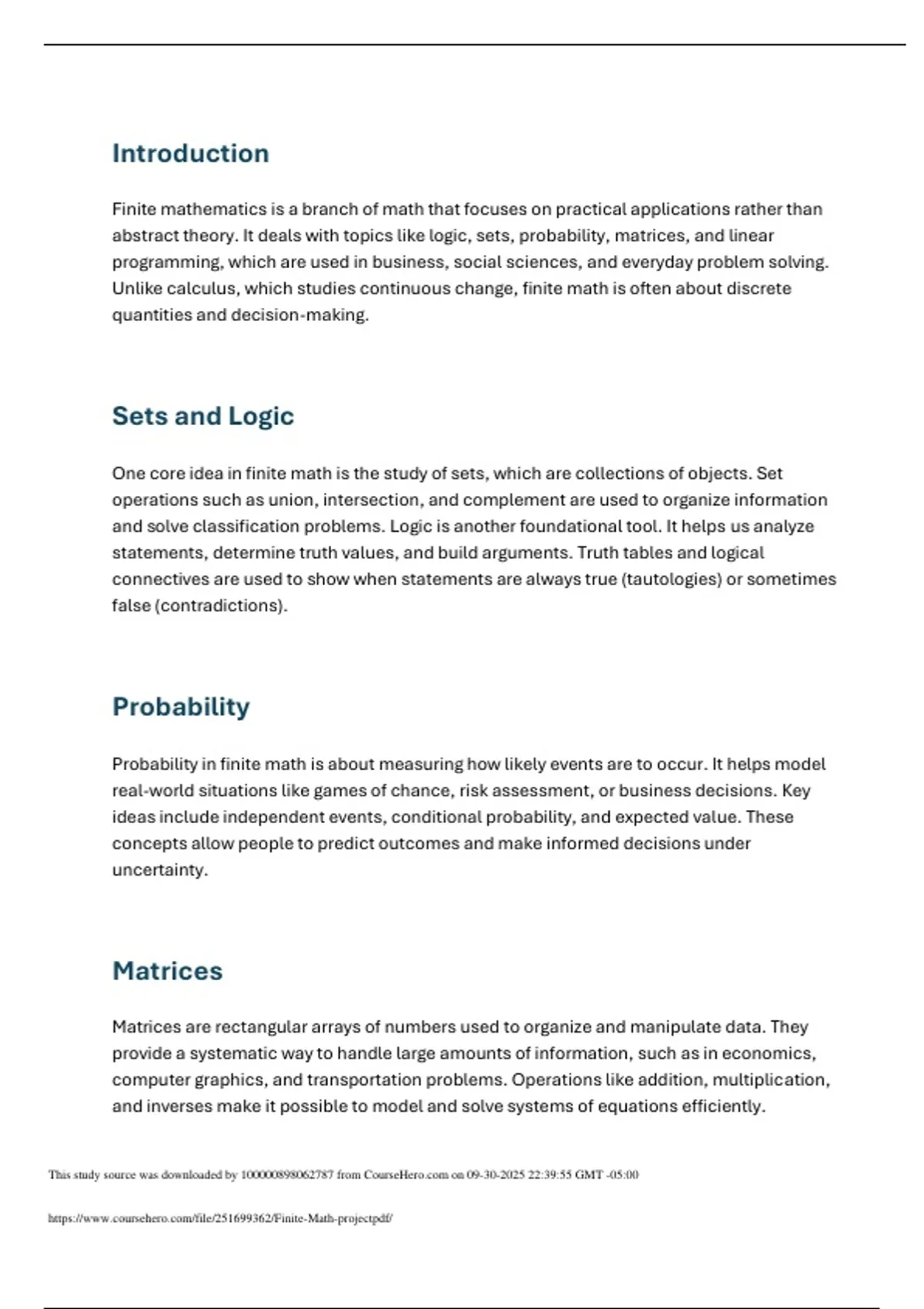 abstract theory. It deals with topics like logic, sets, probability, matrices, and linear