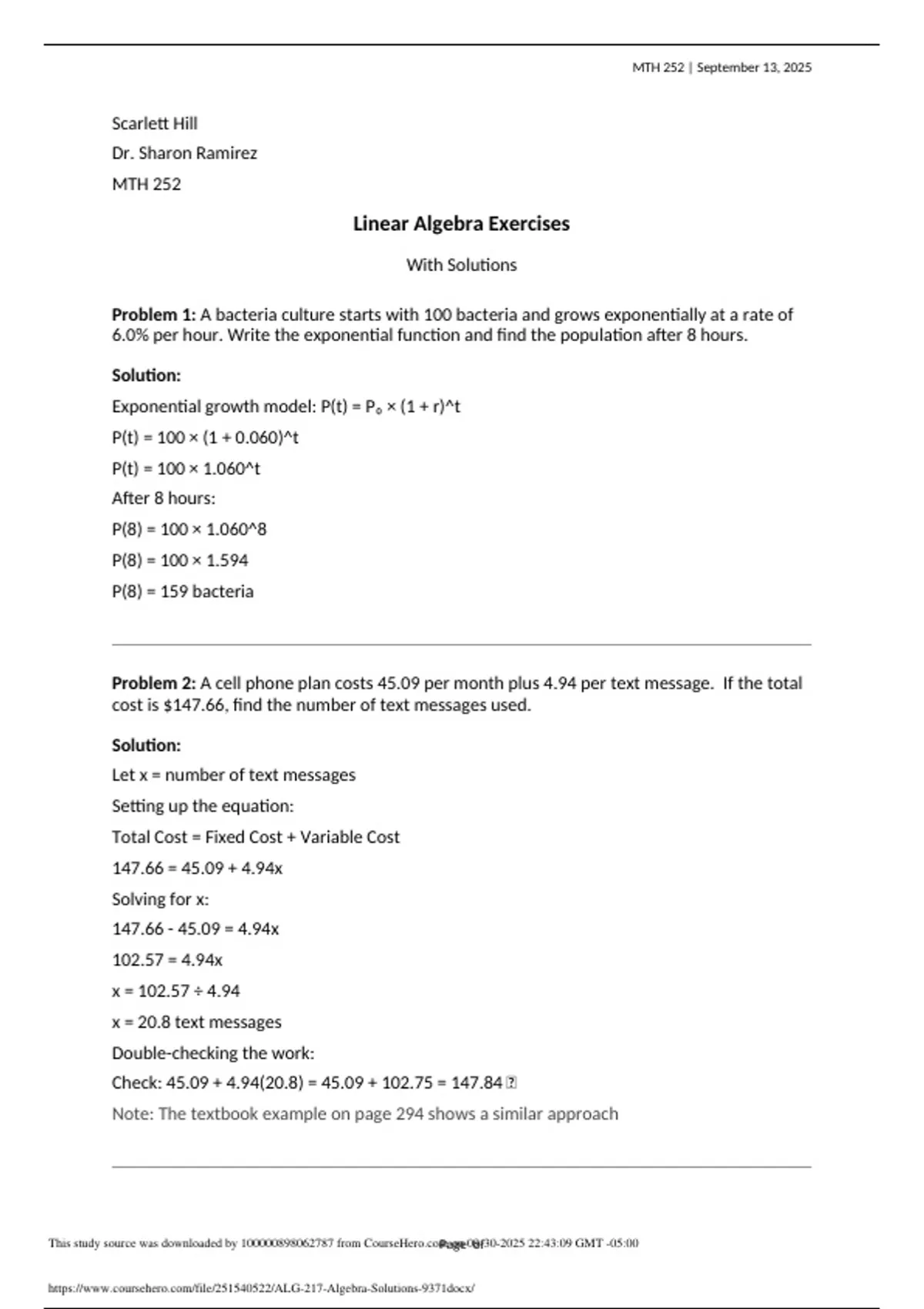 ALG 217 Algebra Solutions 9371 MTH 252 Linear Algebra Exercises With Solutions (Fall 2025)