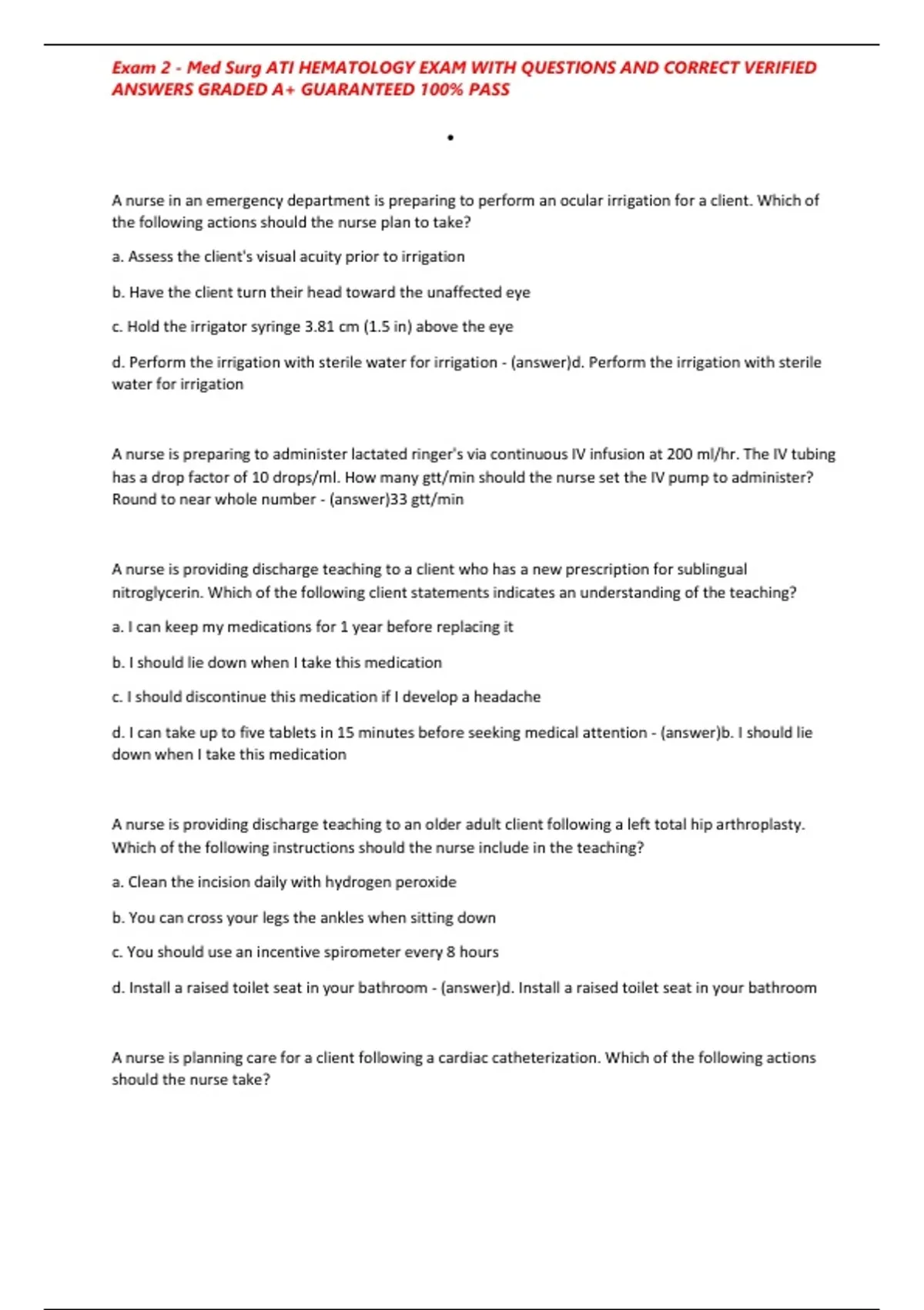 , Exam 2 - Med Surg ATI HEMATOLOGY EXAM WITH QUESTIONS AND CORRECT VERIFIED