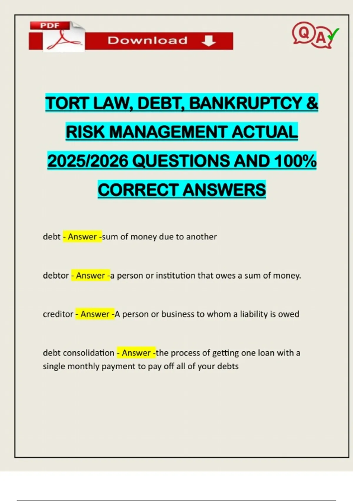 TORT LAW, DEBT, BANKRUPTCY & RISK MANAGEMENT ACTUAL 2025/2026 QUESTIONS AND 100% CORRECT ANSWERS debt - Answer -sum of money due to another debtor - Answer -a person or institution that owes a sum of money. creditor - Answer -A person or business to whom a liability is owed debt consolidation - Answer -the process of getting one loan with a single monthly payment to pay off all of your debtsNeed assistance on Online classes, Exams & Assignments? Reach out for instant help!! Full Course Assistance, Plagiarism-free Essay Writing, Research Paper, Dissertation, Discussion Posts, etc…. Confidential & Secure services. Tutors are available for all subjects! Email now at: open ended credit (revolving) - Answer -debtors are given a borrowing limit which may be increased or decreased by the creditor EX: Credit Card Closed Ended Credit - Answer -debtors are given a specified amount of credit (cash) which can be used to purchase specific consumer goods and intangible goods ( Ex: Student Loan, Car Loan, Home Mortgage Good Debt - Answer -debt which can produce additional wealth in the long run Good debt vs. bad debt - Answer -Good debt: increased credentials, access to certain jobs, increased salary - appreciates in value Bad debt: if a degree is not earned, if cr