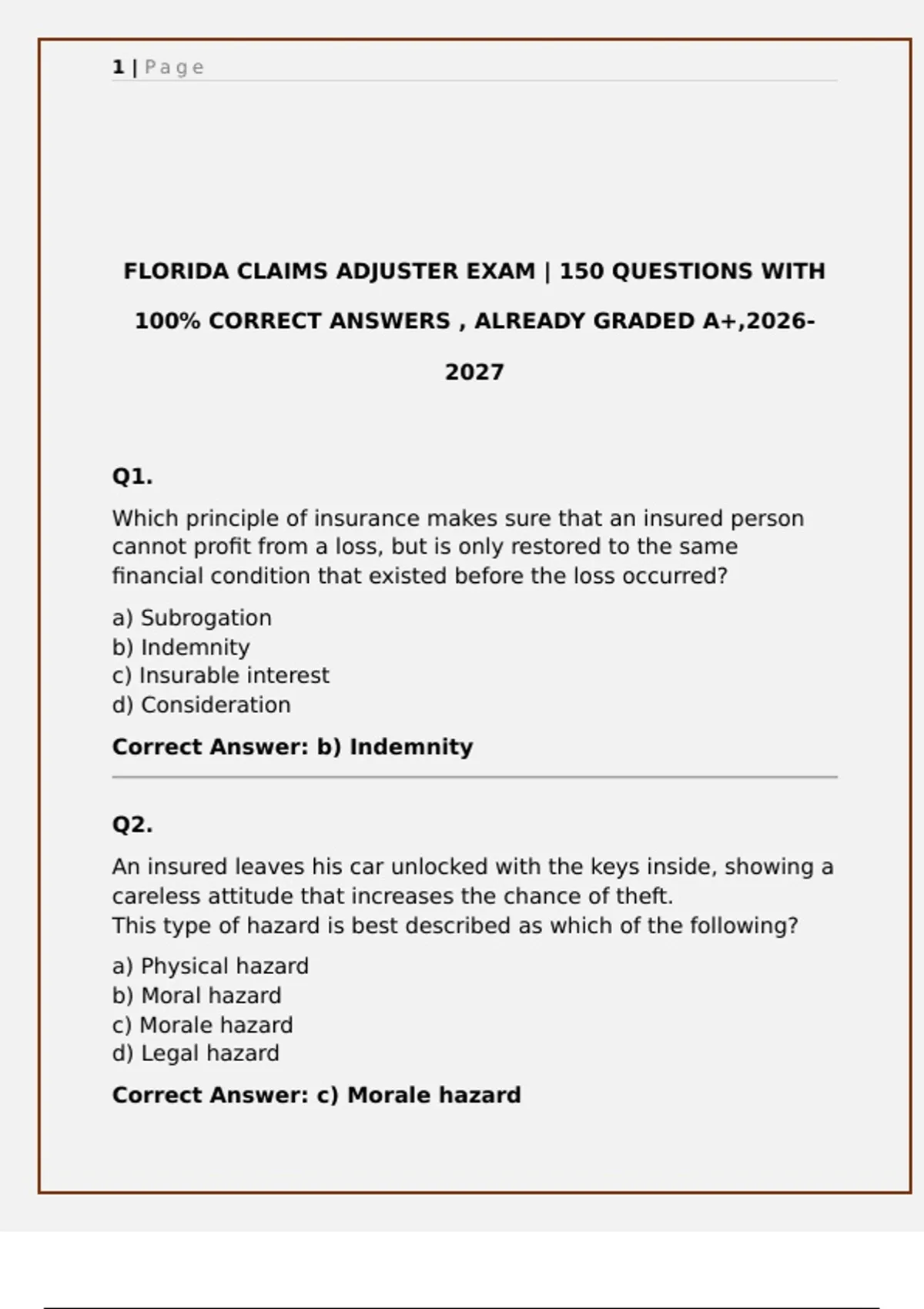 FLORIDA CLAIMS ADJUSTER EXAM | 150 QUESTIONS WITH