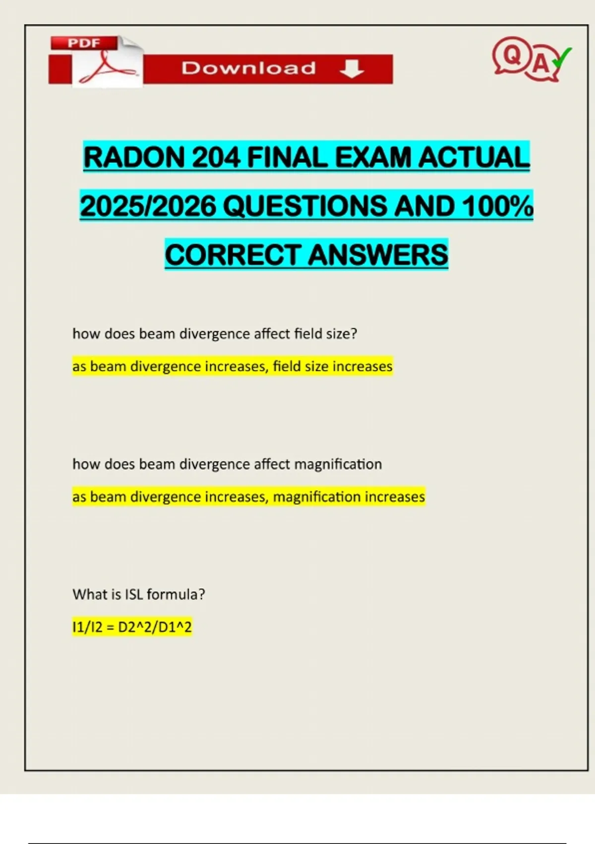 RADON 204 FINAL EXAM ACTUAL 2025/2026 QUESTIONS AND 100% CORRECT ANSWERS how does beam divergence affect field size? as beam divergence increases, field size increases how does beam divergence affect magnification as beam divergence increases, magnification increases What is ISL formula? I1/I2 = D2^2/D1^2Need assistance on Online classes, Exams & Assignments? Reach out for instant help!! Full Course Assistance, Plagiarism-free Essay Writing, Research Paper, Dissertation, Discussion Posts, etc…. Confidential & Secure services. Tutors are available for all subjects! Email now at: what is the definition of ISL? intensity of the beam is inversely proportional to the square of the distance from the source how can you used ISL? it can be used to find the intensity of a beam at different distances as distance increases, what happens to exposure/dose rate? exposure/ dose rate will decrease what is sterling's formula? ESF= 4(A/P)what is sterling's formula used for and how is it used? used to approximate the "output" for a field Equates a rectangular field with a square field if they had the same area what are the limitations of sterling's formula? it becomes less accurate the more