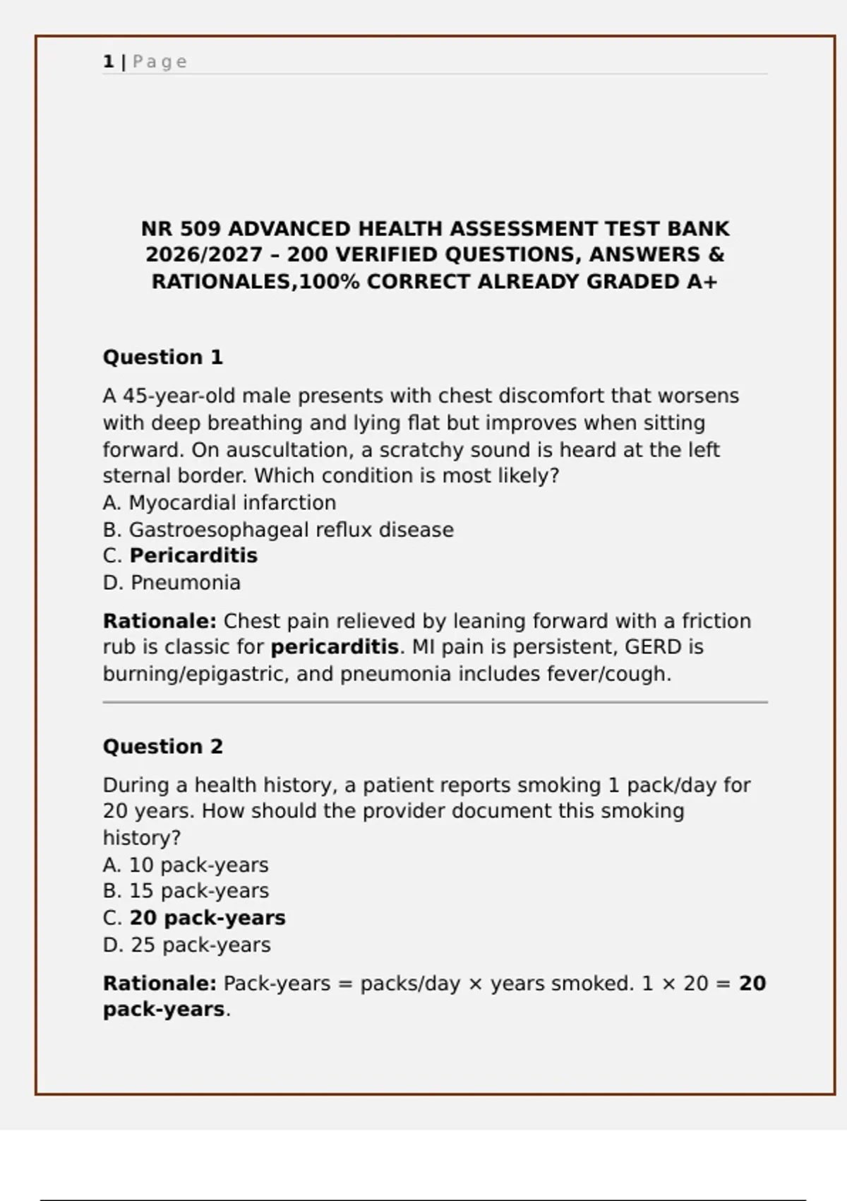 Prepare confidently with the NR 509 Advanced Health Assessment Test Bank 2026/2027, featuring 100 verified questions, correct answers, and detailed rationales. This comprehensive study guide covers essential topics in advanced health assessment, including neurological, cardiovascular, respiratory, abdominal, musculoskeletal, and pediatric exams. Perfect for WGU, Chamberlain, and graduate nursing students, this test bank helps reinforce critical thinking, diagnostic reasoning, and clinical decision-making skills. Updated for 2026/2027, it provides realistic exam-style practice designed to boost performance on midterms, finals, and certification exams. Ace your NR 509 course with this complete, reliable resource for advanced health assessment success.