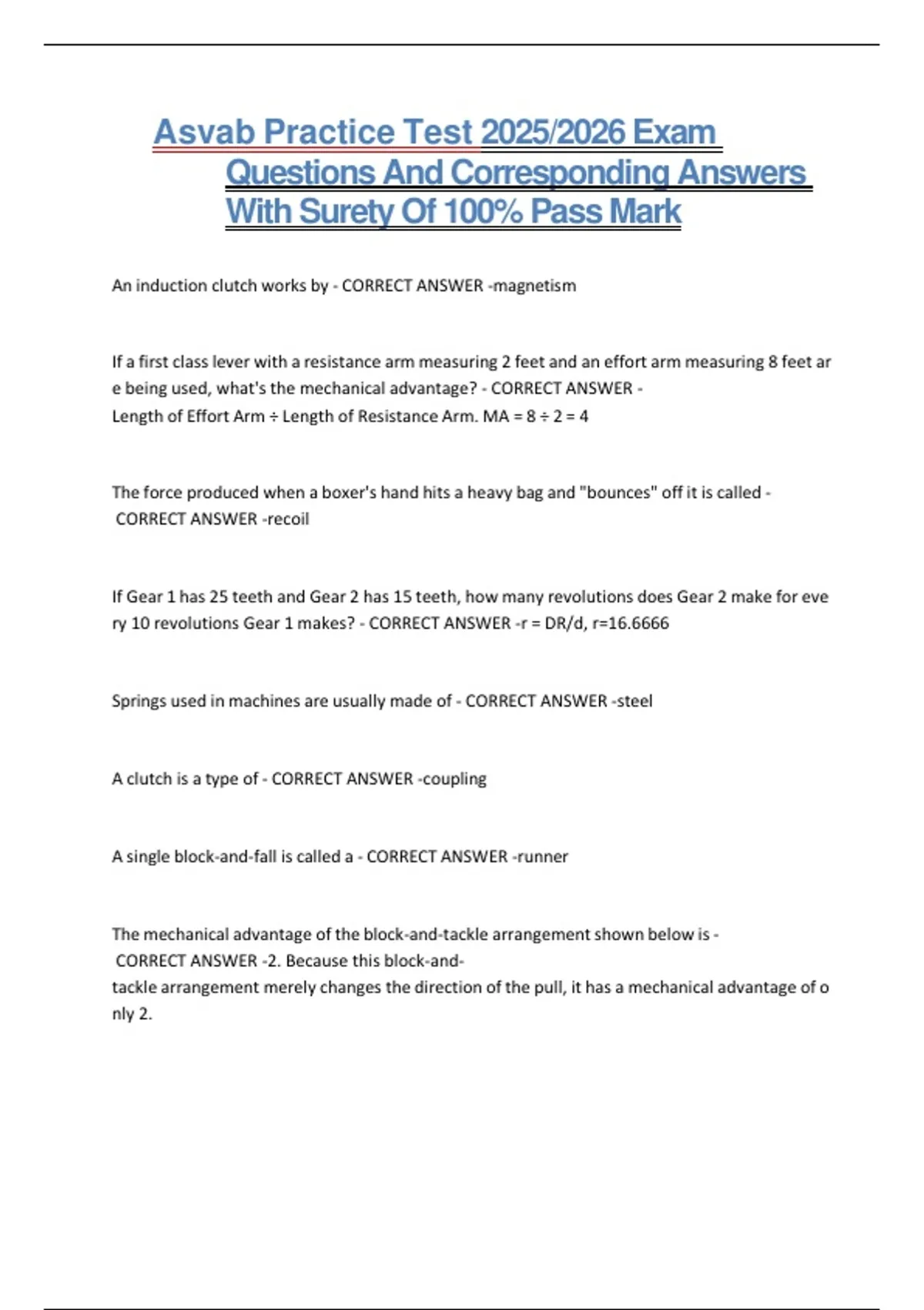 Asvab Practice Test 2025/2026 Exam Questions And Corresponding Answers With Surety Of 100% Pass Mark