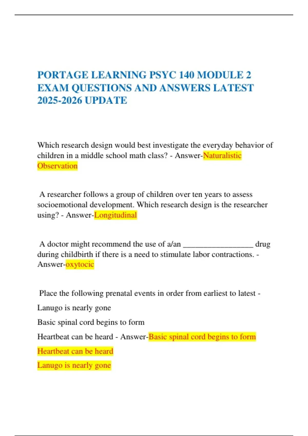 PORTAGE LEARNING PSYC 140 MODULE 2 EXAM QUESTIONS AND ANSWERS LATEST UPDATE